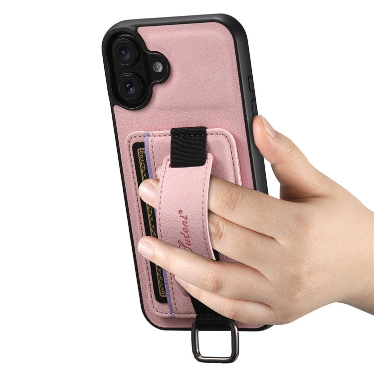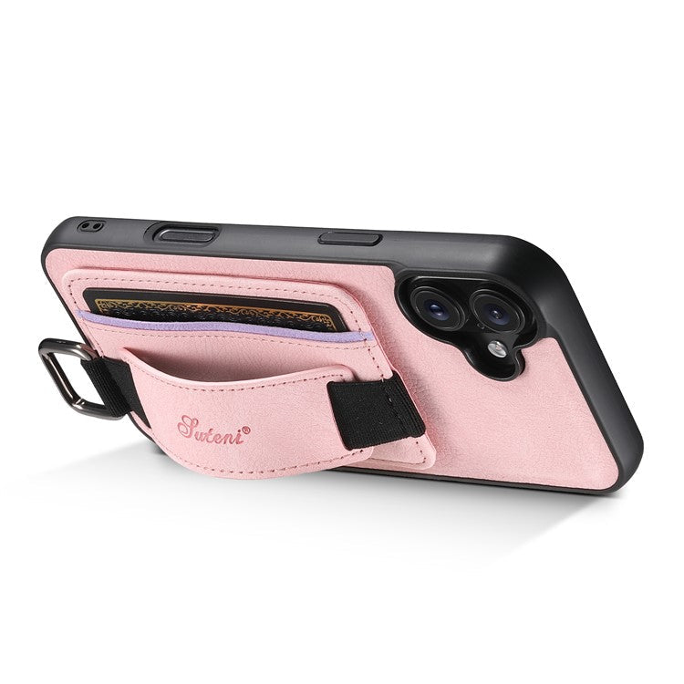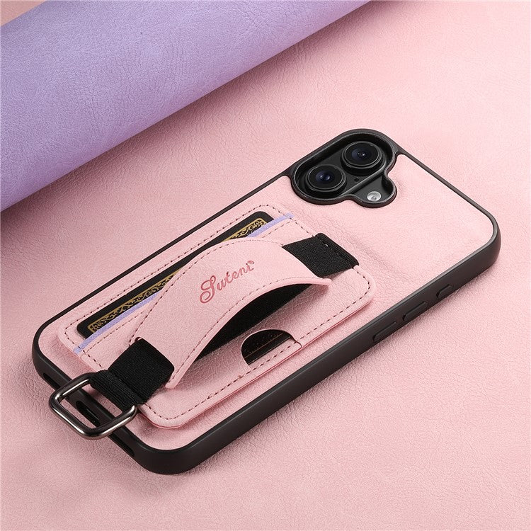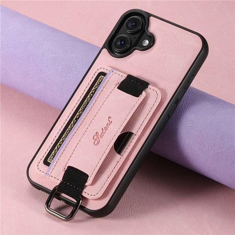 SUTENI H13 For iPhone 16 Case Litchi Texture Leather+TPU+PC Cover with Card Holder Kickstand - Pink