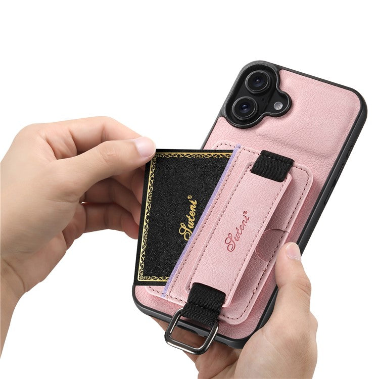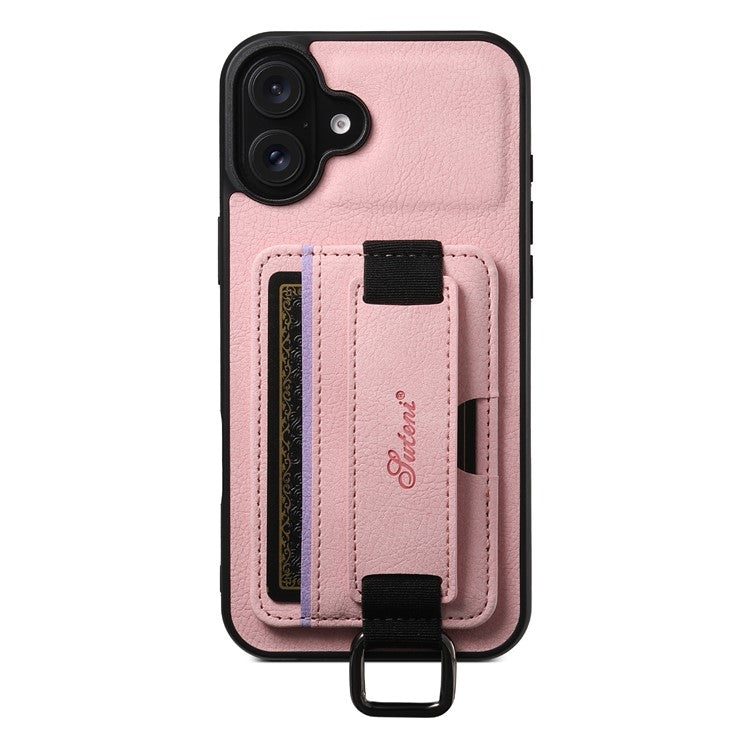 SUTENI H13 For iPhone 16 Plus Case Litchi Texture Leather+TPU+PC Cover with Card Holder Kickstand - Pink