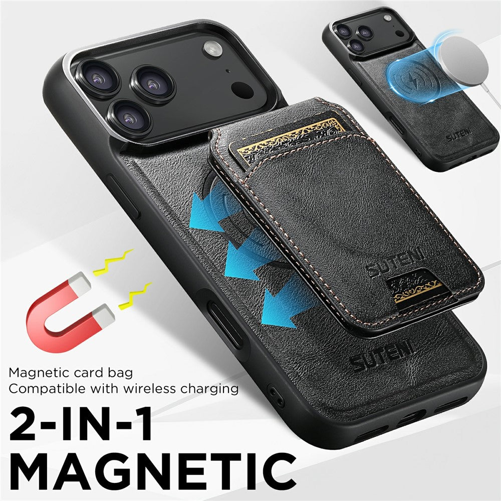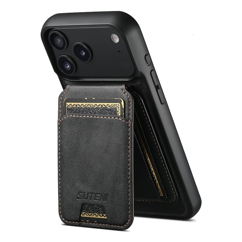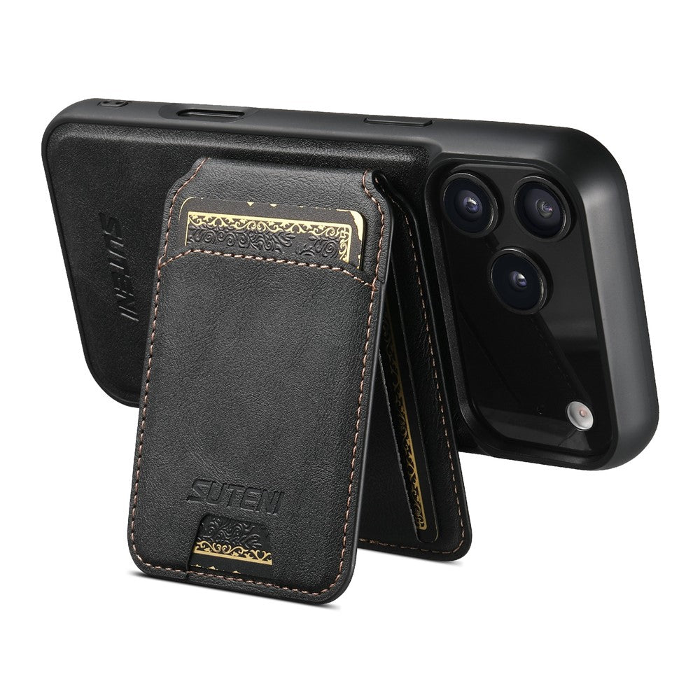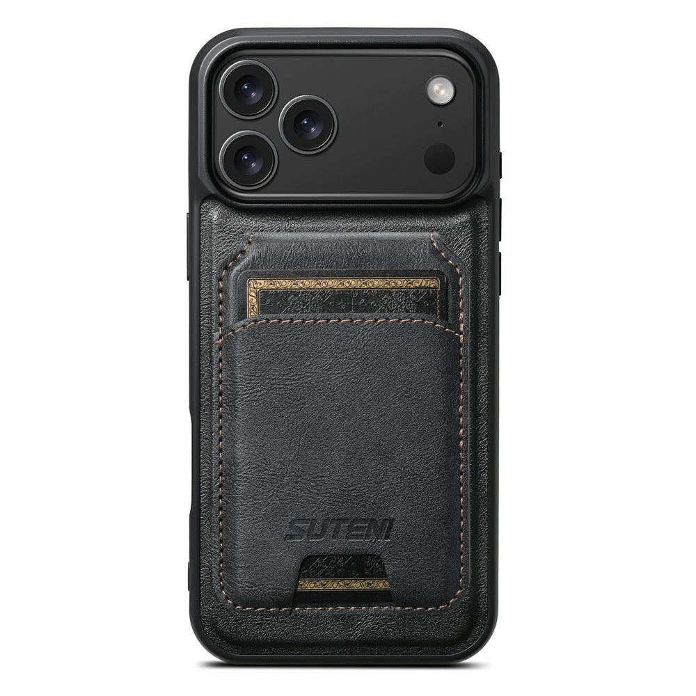 SUTENI M5 For iPhone 17 Pro Max Magnetic Case with Card Bag Cowhide Texture Leather Phone Back Cover - Black