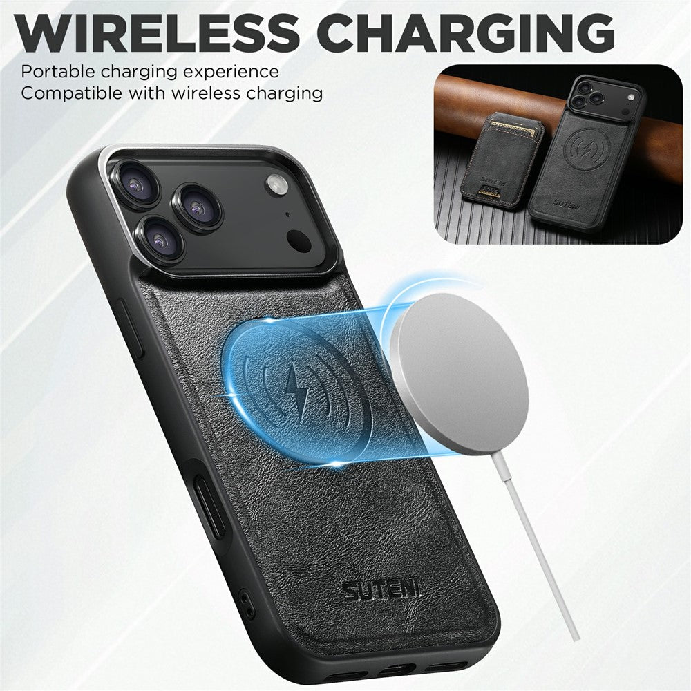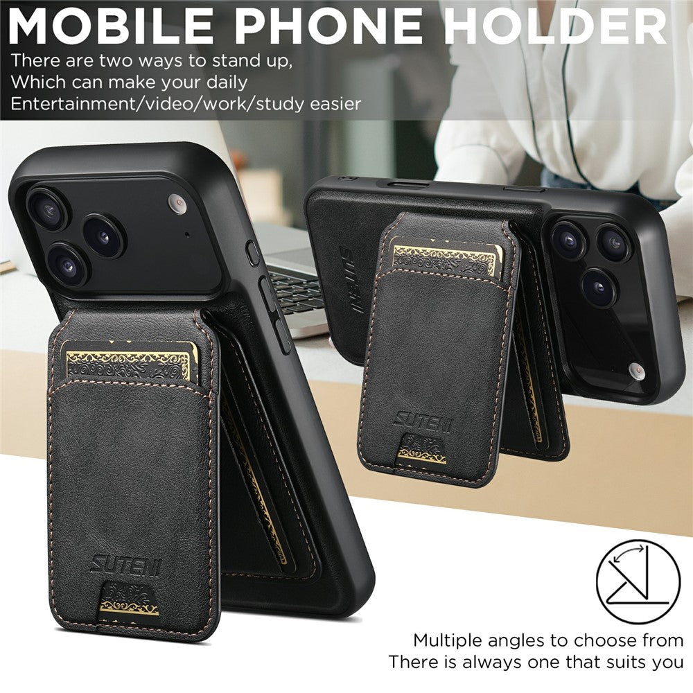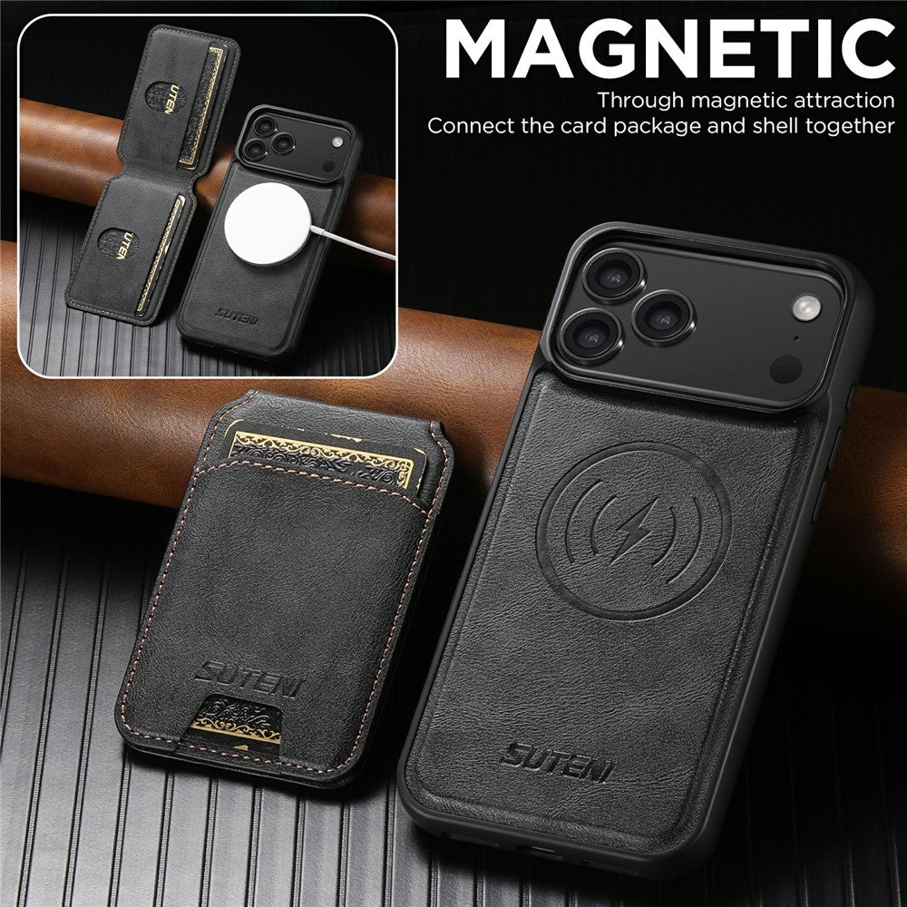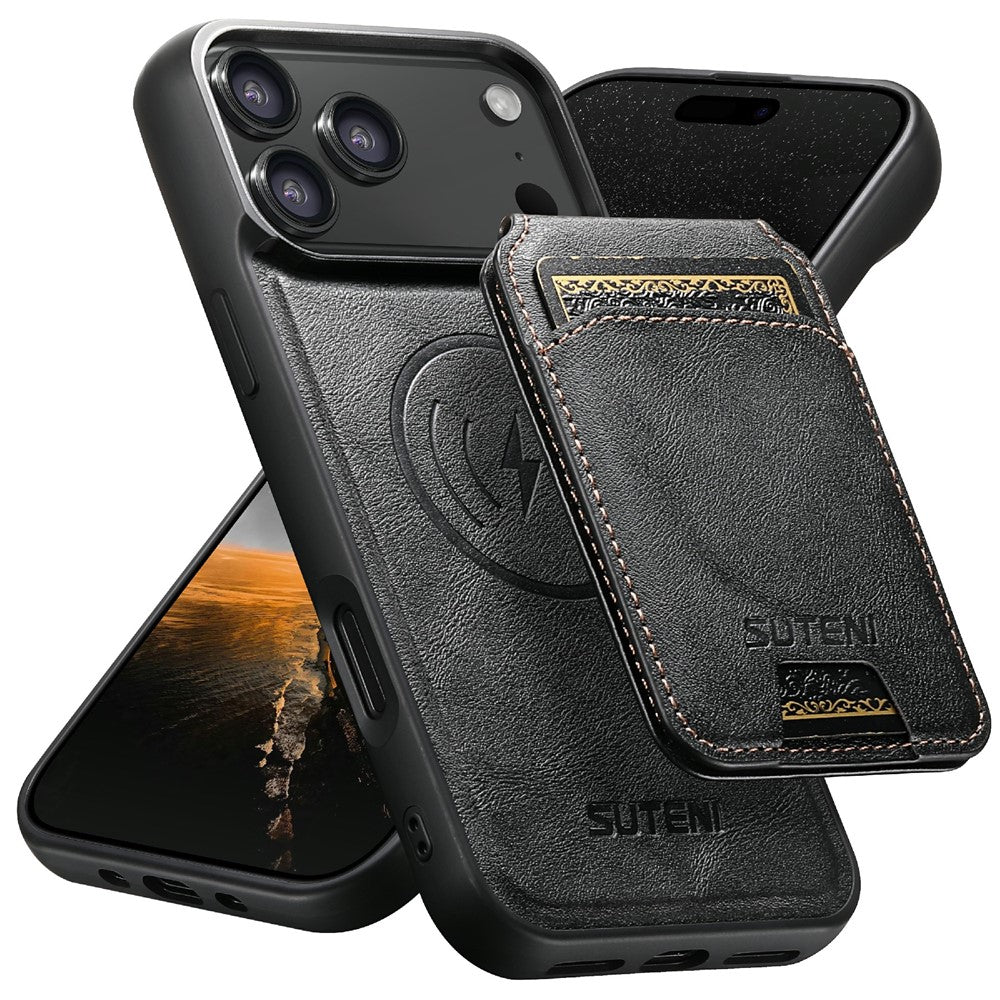 SUTENI M5 For iPhone 17 Pro Max Magnetic Case with Card Bag Cowhide Texture Leather Phone Back Cover - Black