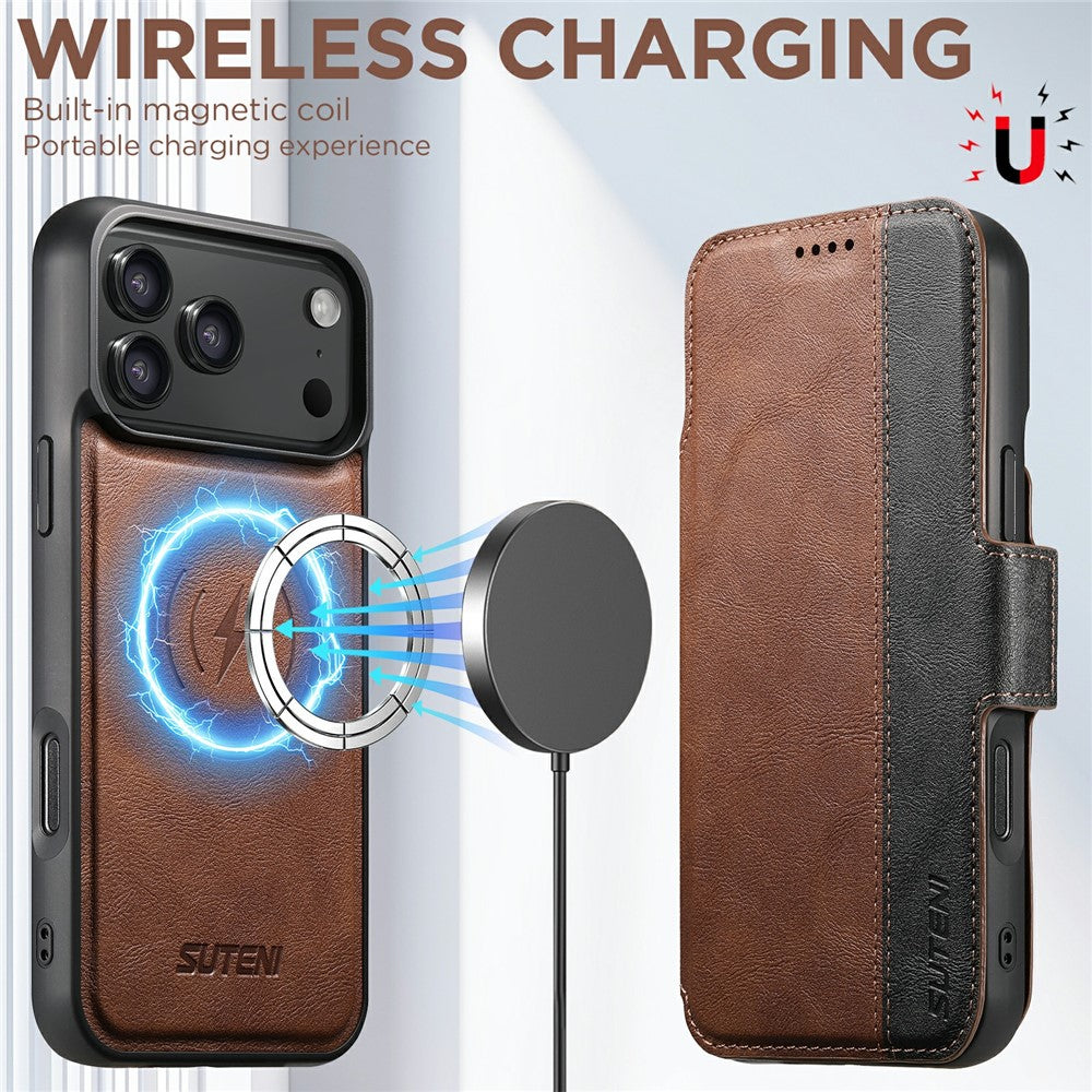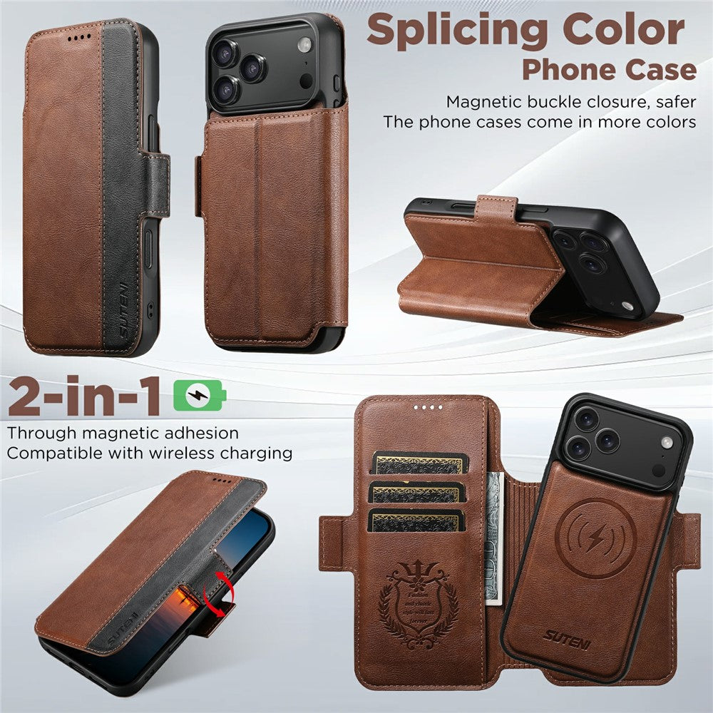 SUTENI Q-07 For iPhone 17 Pro Max Case Magnetic Color Splicing Cowhide Texture Leather Cover - Brown