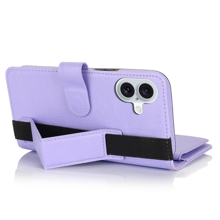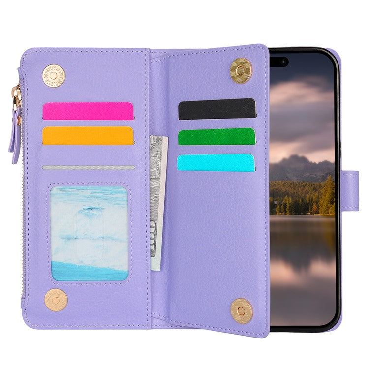 XL-001 For iPhone 16 Case Zipper Pocket Wristband Stand Leather Phone Cover - Purple