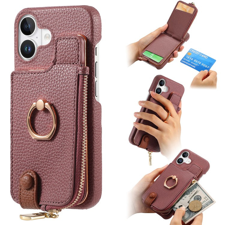 Y3 For iPhone 16 Plus Case Card Holder Kickstand Leather+TPU Phone Cover with Zipper Pocket - Purple