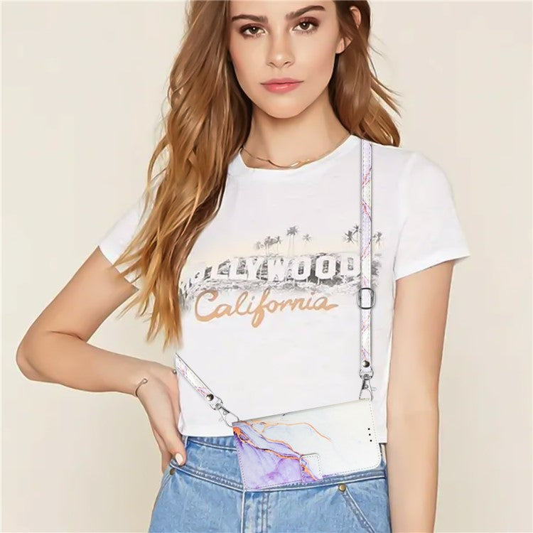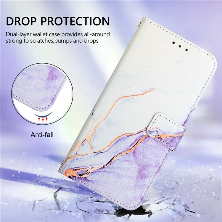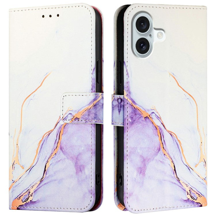 YB Pattern Printing Leather Series-6 For iPhone 16 Case Marble Wallet Crossbody Phone Cover - White / Purple LS006