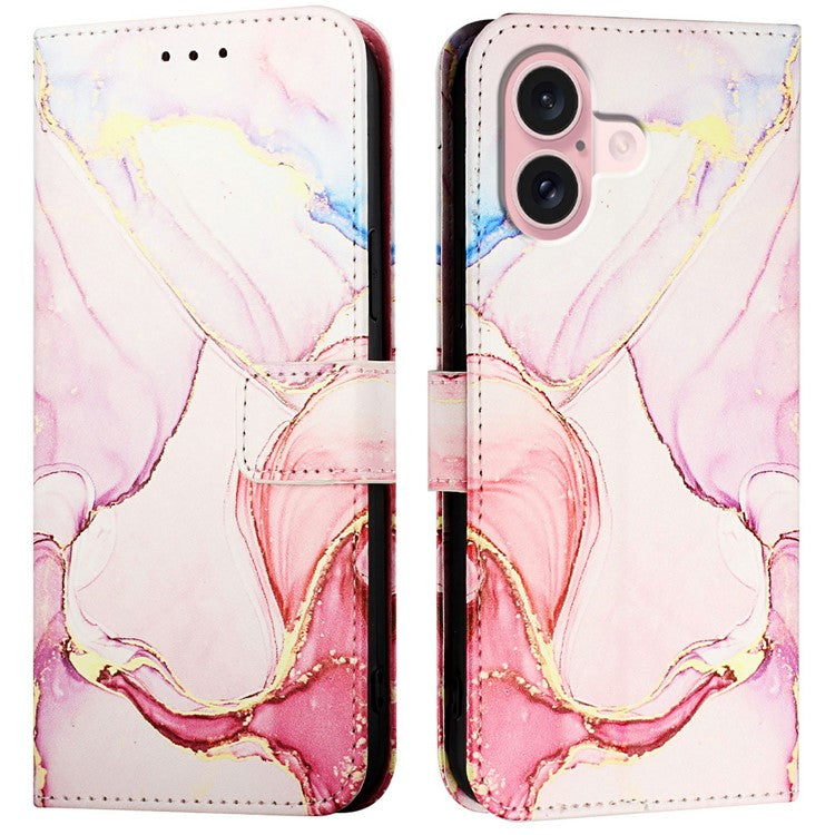 YB Pattern Printing Leather Series-6 For iPhone 16 Plus Case Marble Wallet Crossbody Phone Cover - Rose Gold LS005