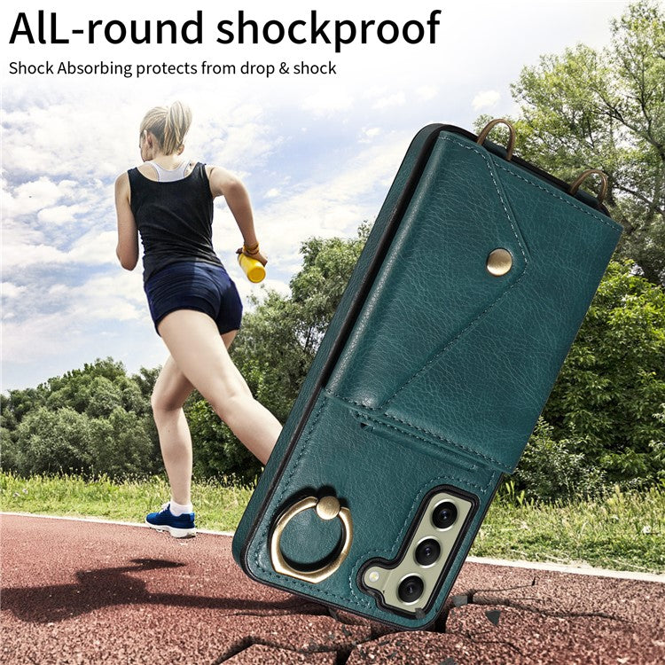 002 For Samsung Galaxy S21 FE 5G Card Bag Ring Kickstand Cover Litchi Texture Leather Coated TPU Anti-fall Phone Case with Shoulder Strap - Green