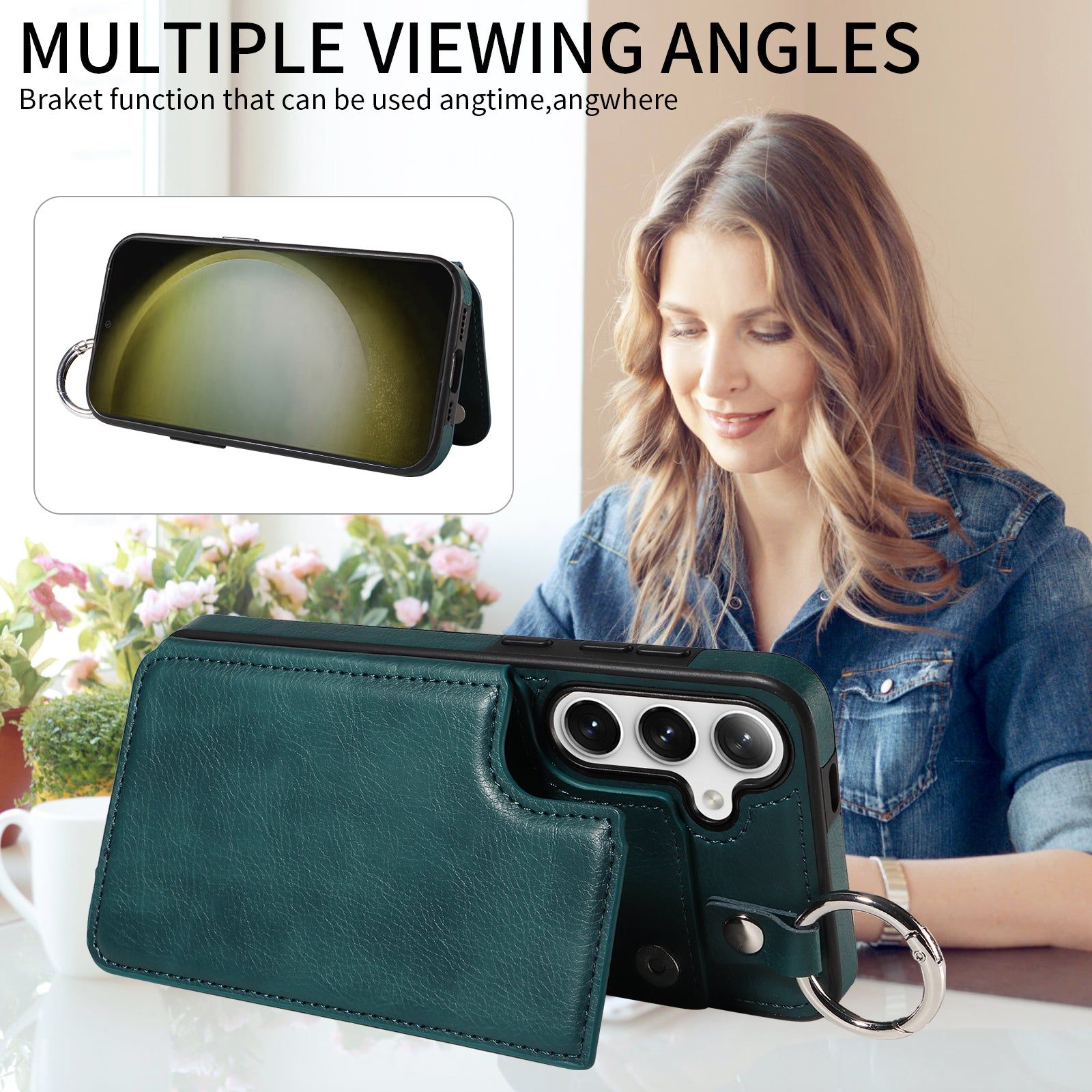 003 For Samsung Galaxy S24 Case Litchi Texture PU Leather Phone Cover with Ring Buckle - Blue Green - UNIQKART