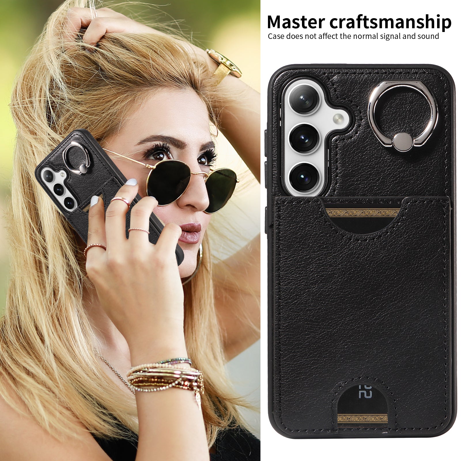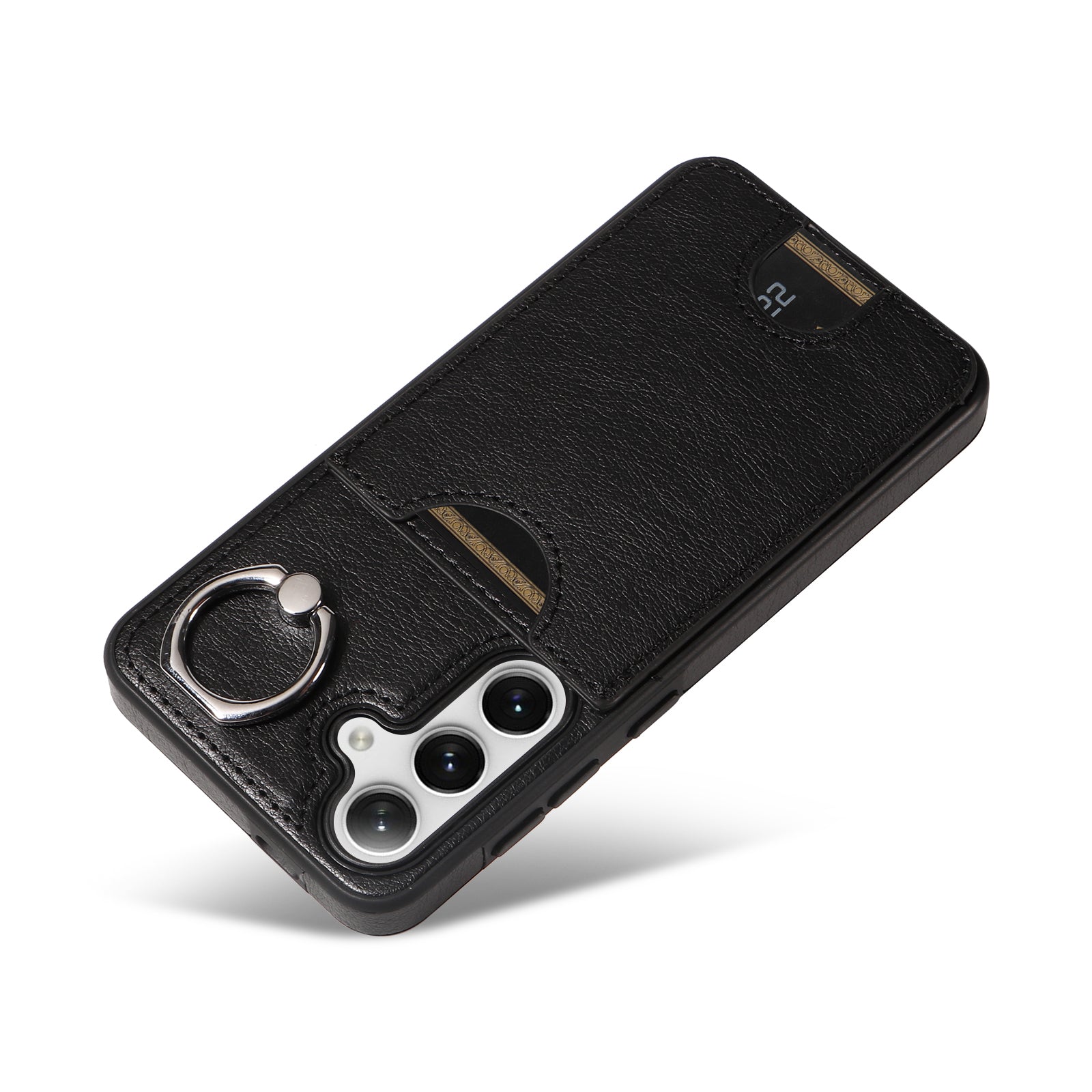 006 For Samsung Galaxy S24 Case with Card Slot Calf Texture Phone Cover Ring Holder - Black