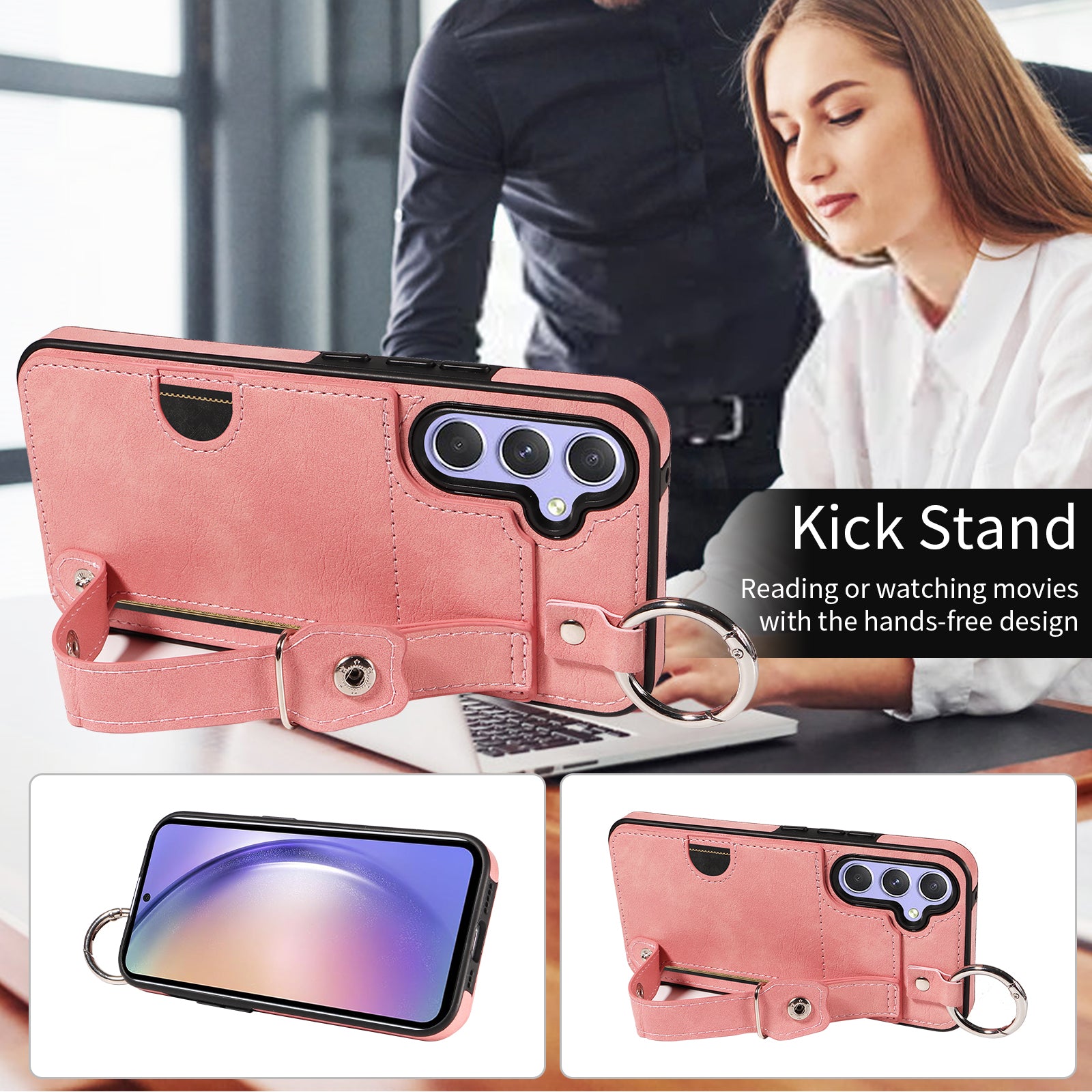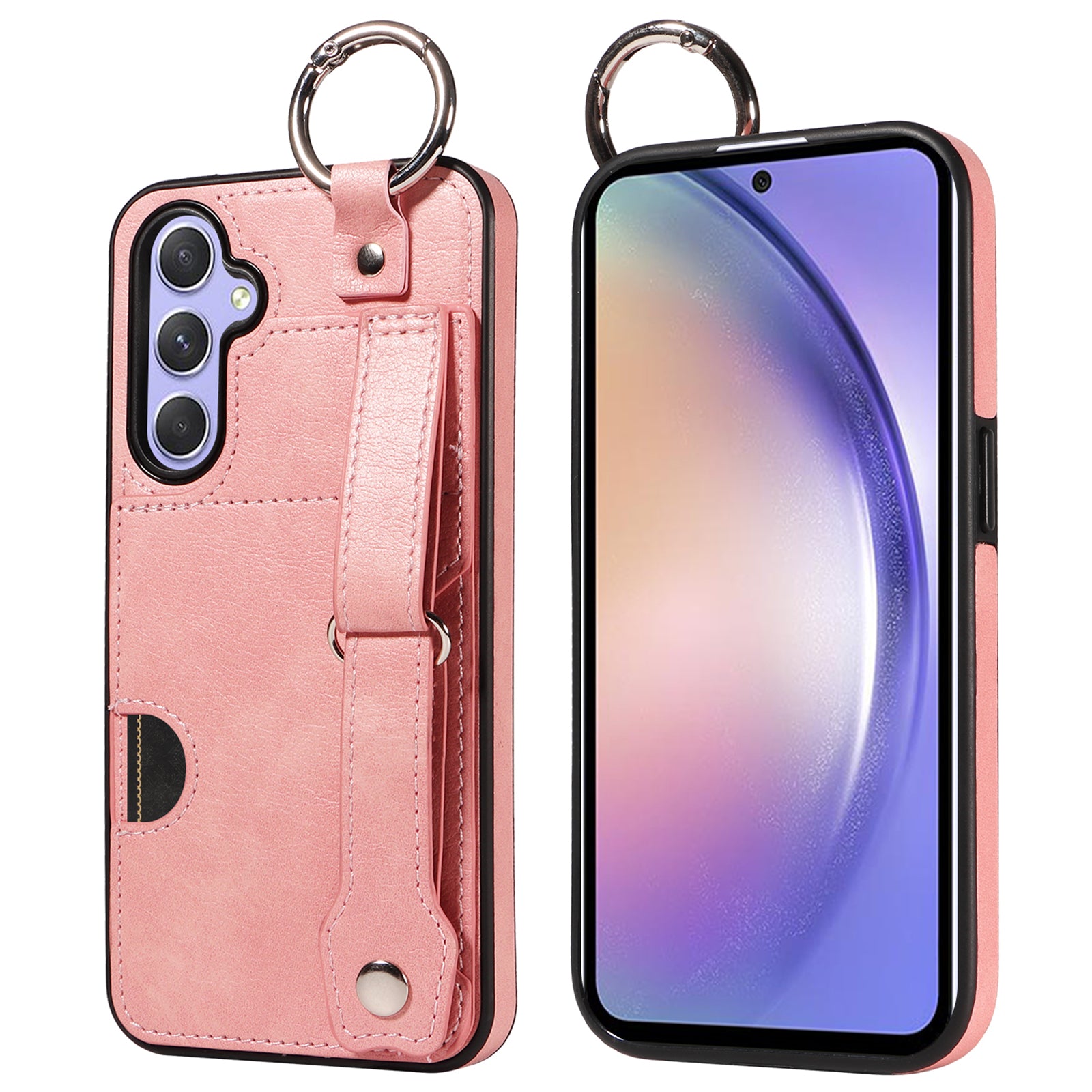 008 For Samsung Galaxy A54 5G Phone Case with Wrist Strap Kickstand Leather+TPU Shell - Pink