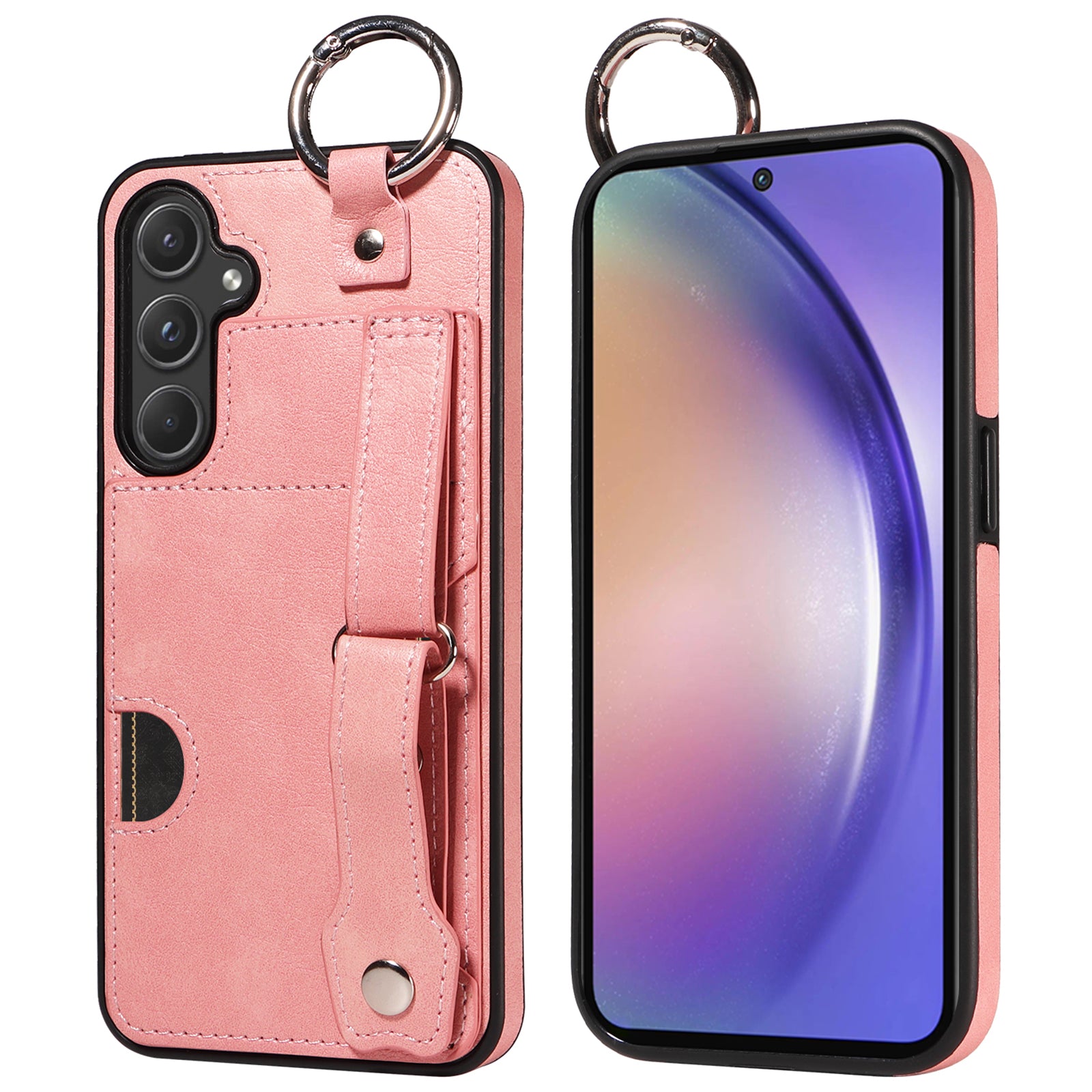 008 For Samsung Galaxy A55 5G Case with Wrist Strap Kickstand Leather+TPU Phone Cover - Pink