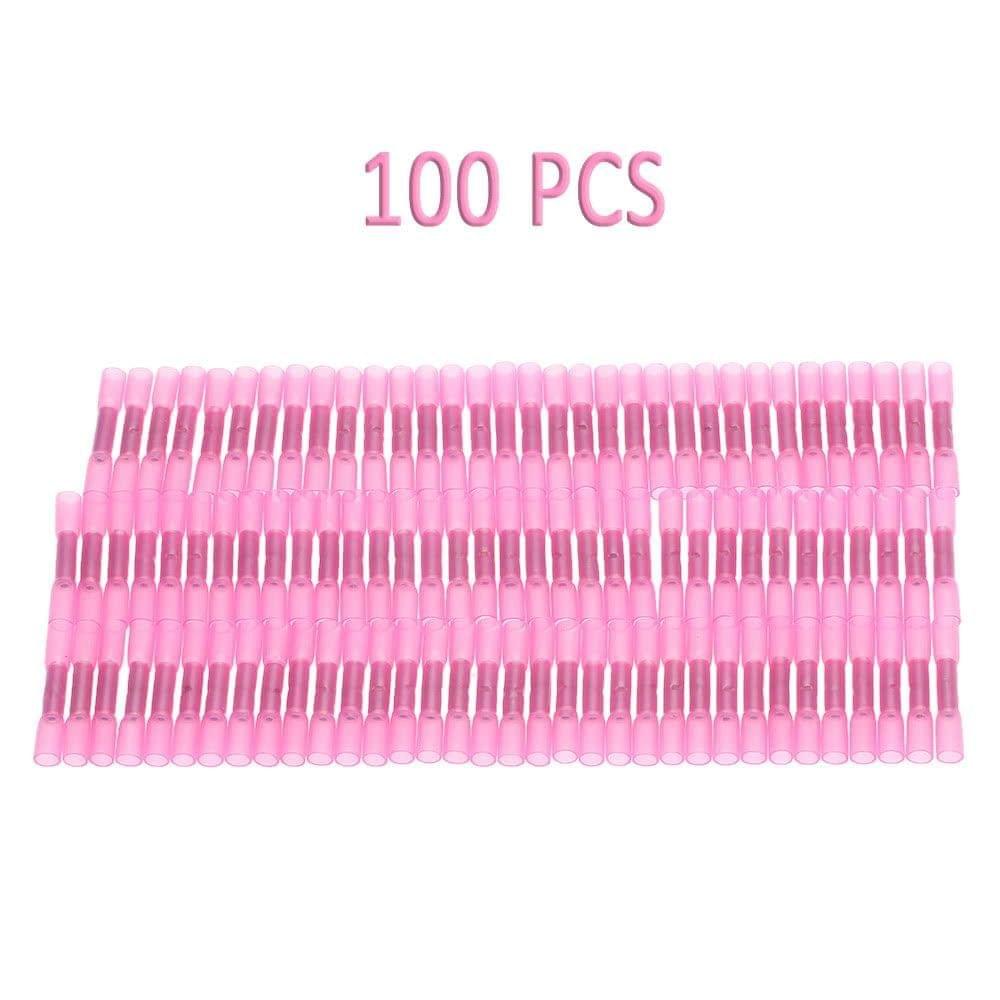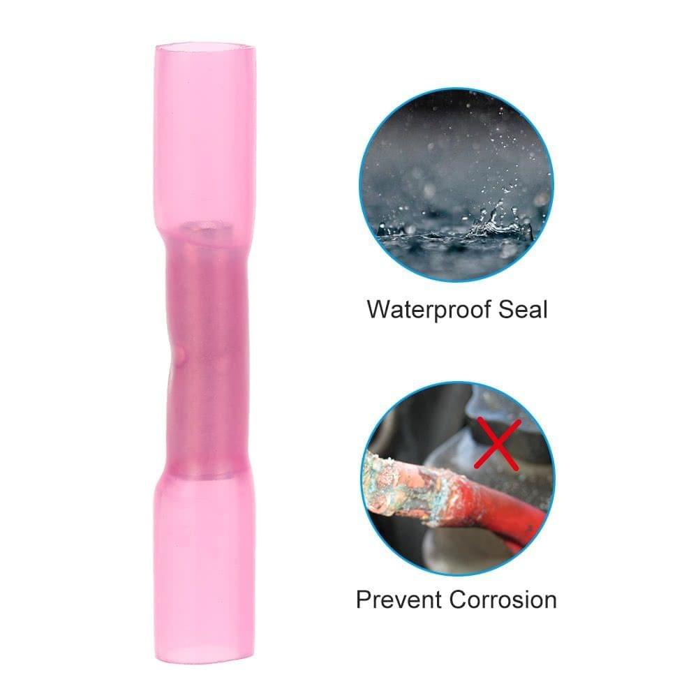 description":"These are 100 pieces Heat Shrink Butt Connectors, which can give the connection a effective protection, even in awful condition. Features: Heat shrink wire crimp terminals butt, can strongly hold the crimps. Waterproof and prevent corrosion, can effectively protect the connection. Allow visual inspection. Easy to install. Once crimped, heat with a heat gun to shrink, creating a permanent waterproof bond. Compare to ordinary connector, it's more durable and convenient. These work great for automotive, marine, and many other applications. Specifications: Color: clear red Suits cable / wire sizes: 0.5-1.5mm / 22-18AWG Length: approx. 35mm Quantity: 100pcs Voltage resistant: ?600V Volume resistivity(? cm): ?10 15 Dielectric strength(KV/mm): ?25 Protection type: IP67 Operating temperature: -55~125? Package Size: 15 * 10 * 2cm / 6 * 4 * 0.8in Package Weight: 102g / 3.6oz Package list: 100 * Heat Shrink Butt Wire Crimp Connector Tips: Once crimped, heat with a heat gun to shrink the out sleeve and activate the adhesive creating a permanent waterproof bond.