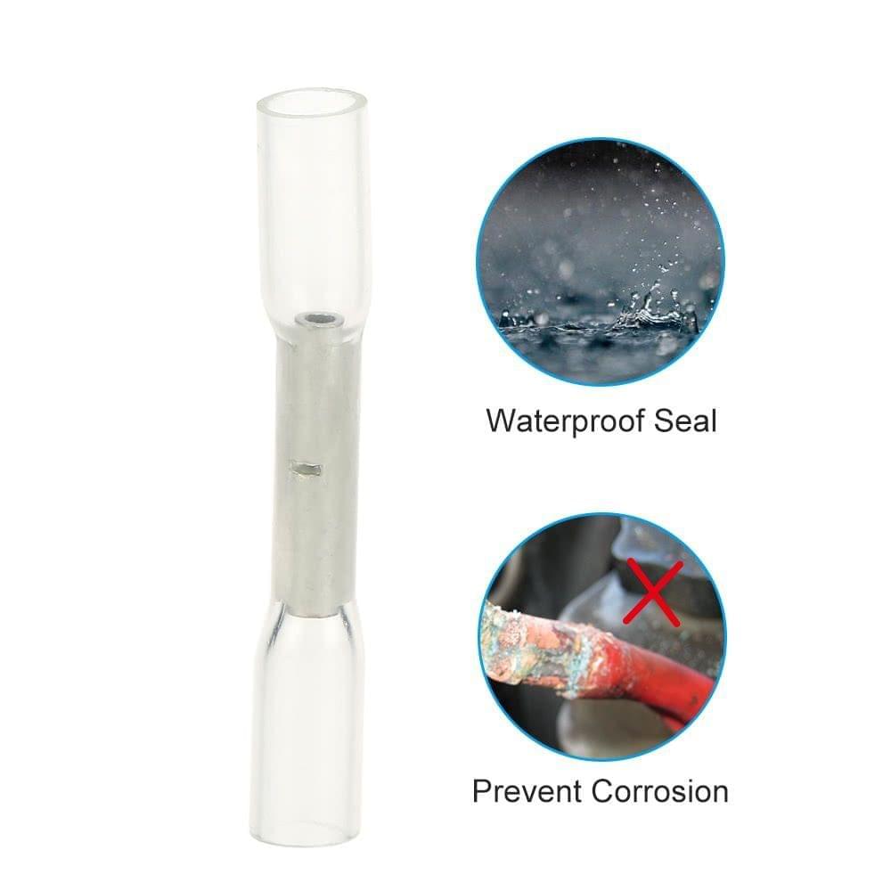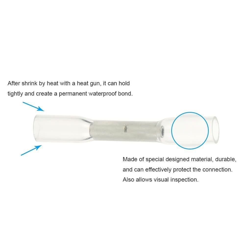 description":"These are 100 pieces Heat Shrink Butt Connectors, which can give the connection a effective protection, even in awful condition. Features: Heat shrink wire crimp terminals butt, can strongly hold the crimps. Waterproof and prevent corrosion, can effectively protect the connection. Allow visual inspection. Easy to install. Once crimped, heat with a heat gun to shrink, creating a permanent waterproof bond. Compare to ordinary connector, it's more durable and convenient. These work great for automotive, marine, and many other applications. Specifications: Color: clear Suits cable / wire sizes: 0.25-0.5mm / 26-24AWG Length: approx. 30mm Quantity: 100pcs Voltage resistant: ?600V Volume resistivity(? cm): ?10 15 Dielectric strength(KV/mm): ?25 Protection type: IP67 Operating temperature: -55~125? Package Size: 12 * 8 * 2cm / 4.7 * 3 * 0.8in Package Weight: 40g / 1.4oz Package list: 100 * Heat Shrink Butt Wire Crimp Connector Tips: Once crimped, heat with a heat gun to shrink the out sleeve and activate the adhesive creating a permanent waterproof bond.