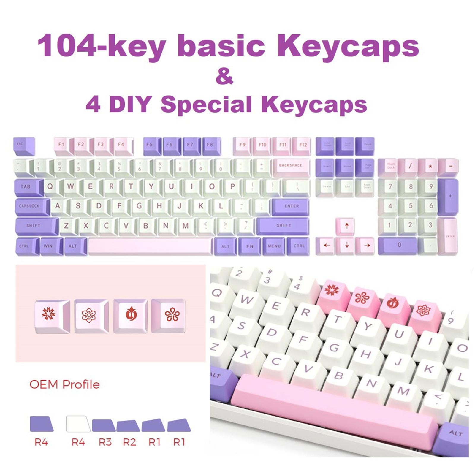 104 Key basic keycaps & 4 DIY Special Keycaps are made of durable PBT plastic, friction resistant and durable.