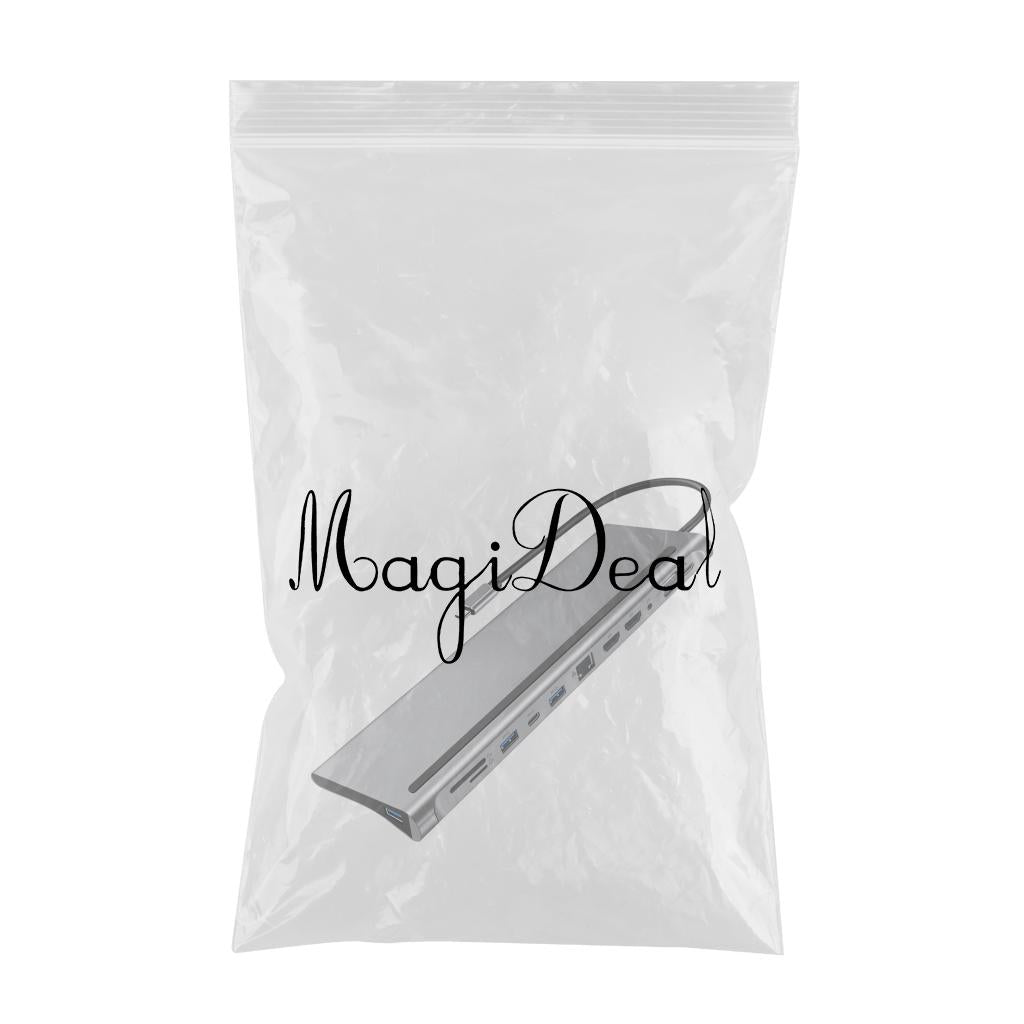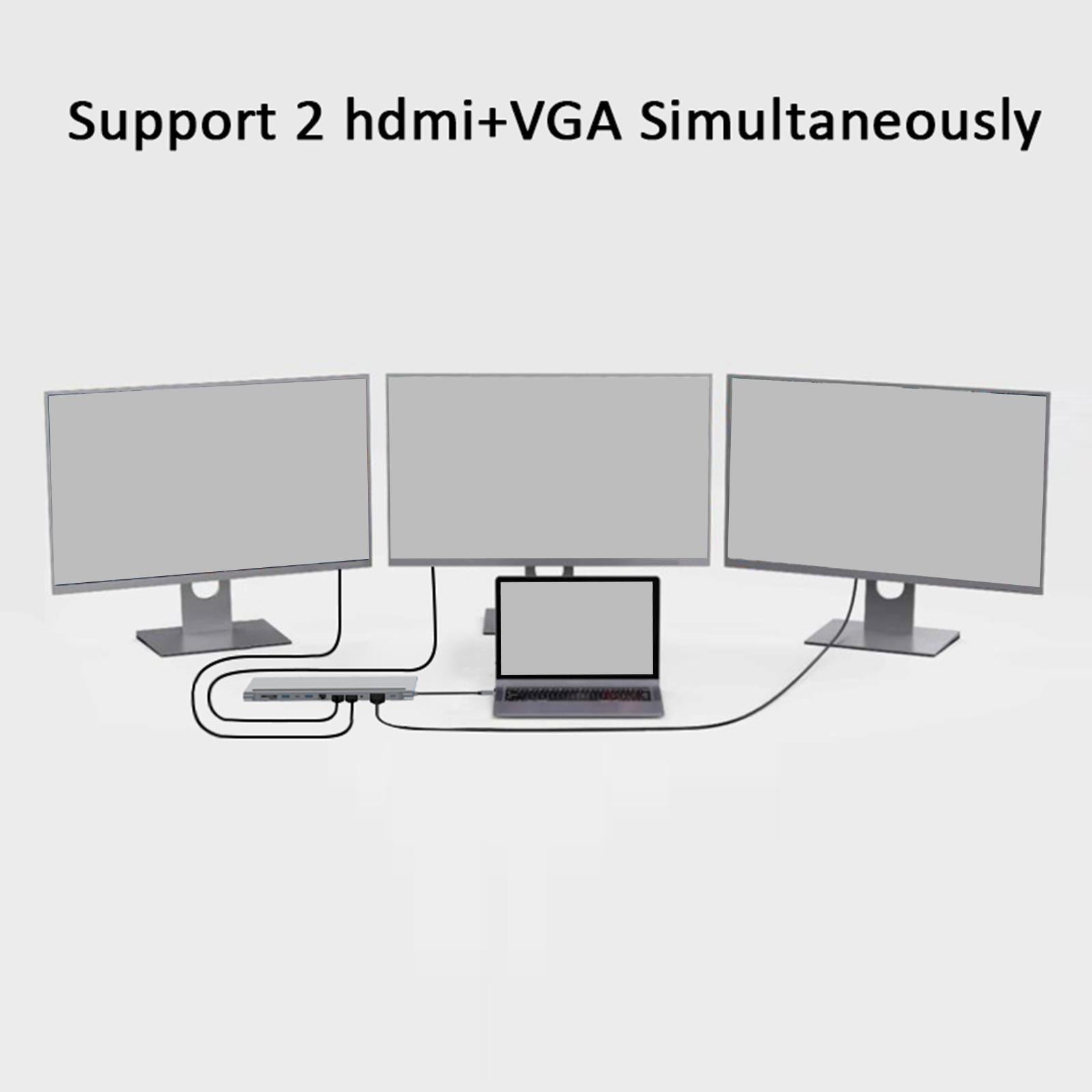 12-in-1 Docking Station: 2x HDTV, 1x VGA, 3x USB3.0, 1x USB-C, 1x USB-C (PD Charge only), 1x 3.5mm Audio headphone port, 1x SD, 1x TF, 1x Ethernet Port.