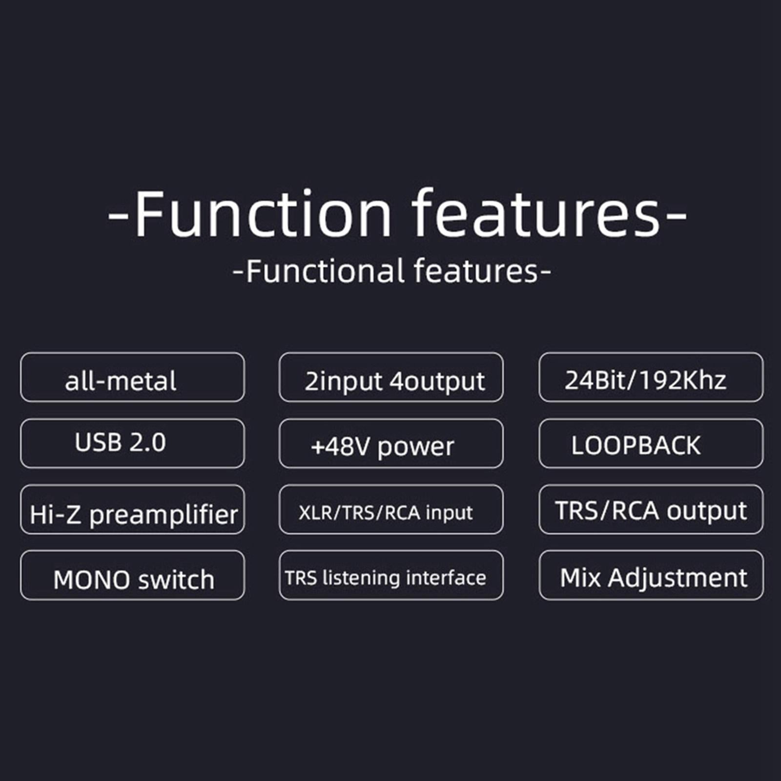 FUNCTION: The audio interface has the loopback function of internal recording, recording of accompaniment background music, plug in the earphone to monitor the sound recording in time and make the first judgment on the recording work.