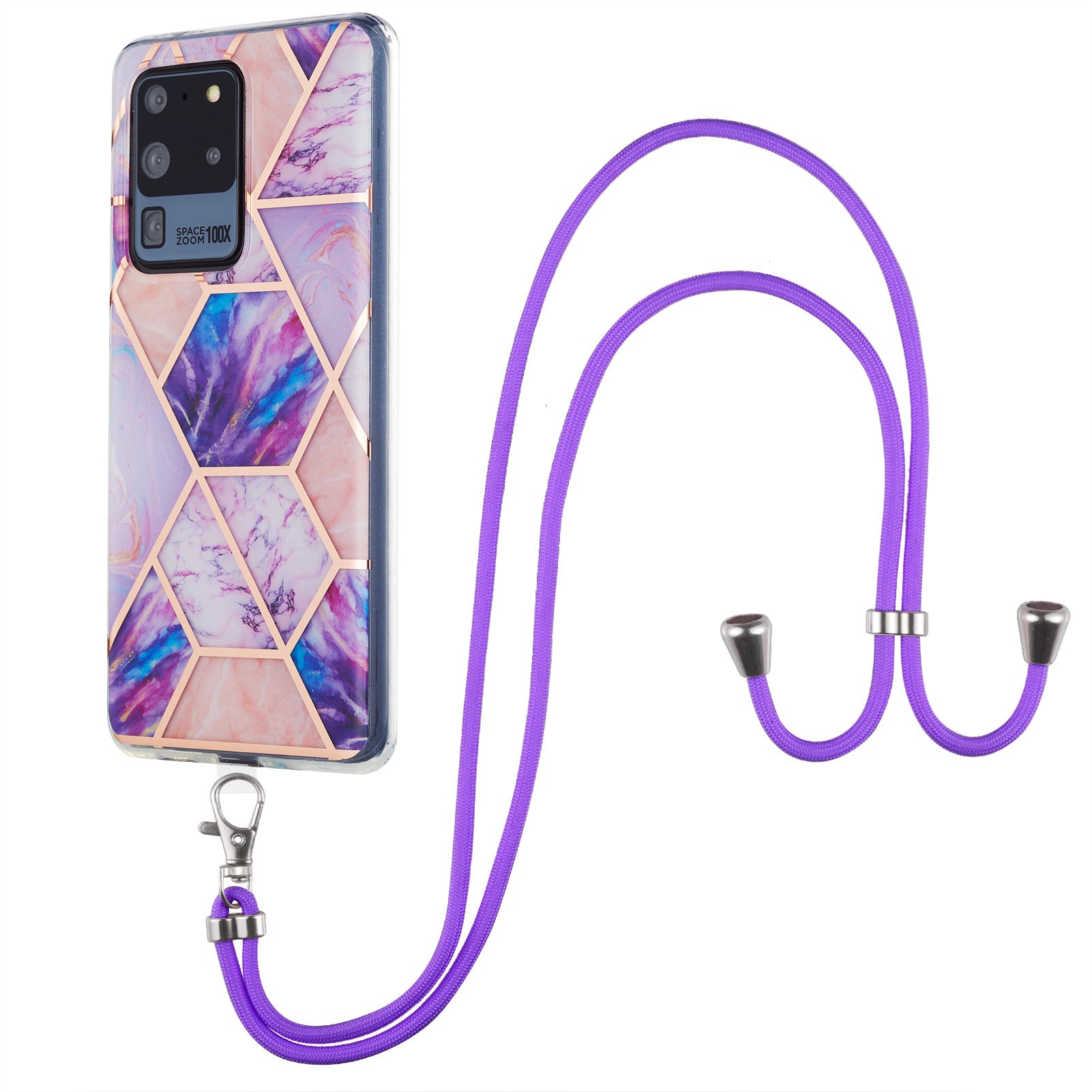 2.0mm IMD TPU Phone Cover + Lanyard IML Marble Pattern Anti-Scratch Electroplating Case for Samsung Galaxy S20 Ultra - Light Purple
