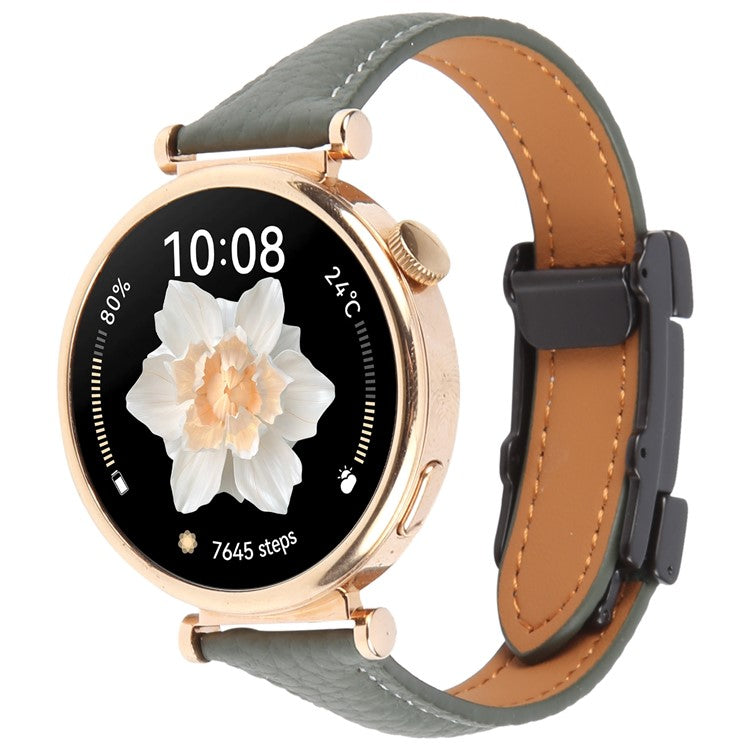20mm Genuine Cow Leather Strap for Samsung Galaxy Watch7 44mm / 40mm / Huawei Watch GT 3 42mm Litchi Texture Magnetic Watch Band - Blackish Green