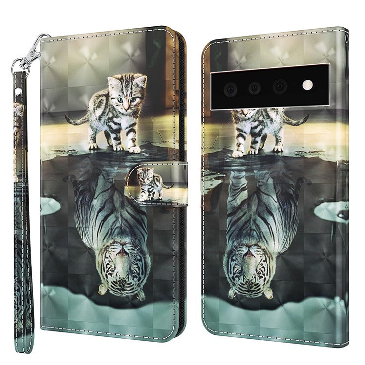 3D Creative Pattern Design PU Leather Wallet Shockproof Stand Flip Magnetic Case with Strap for Google Pixel 6 Pro - Cat and Tiger