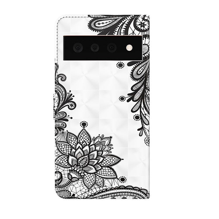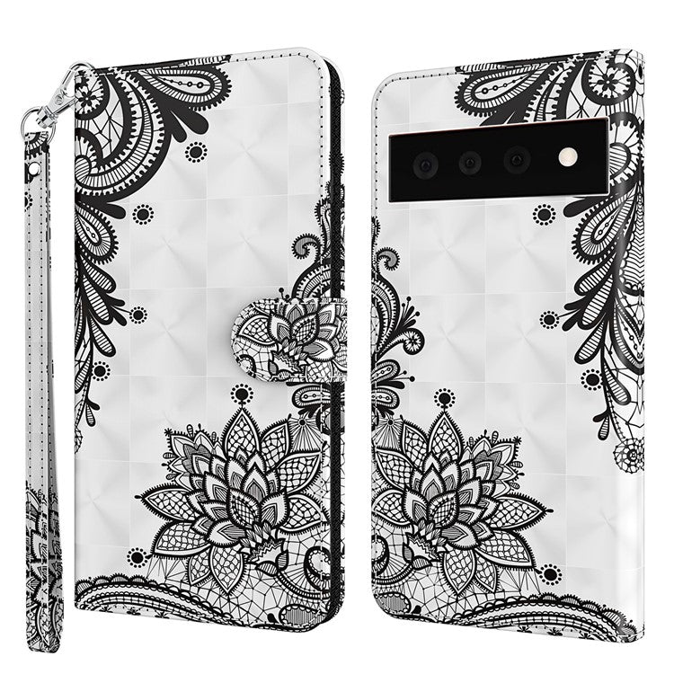3D Creative Pattern Design PU Leather Wallet Shockproof Stand Flip Magnetic Case with Strap for Google Pixel 6 Pro - Lace Flower