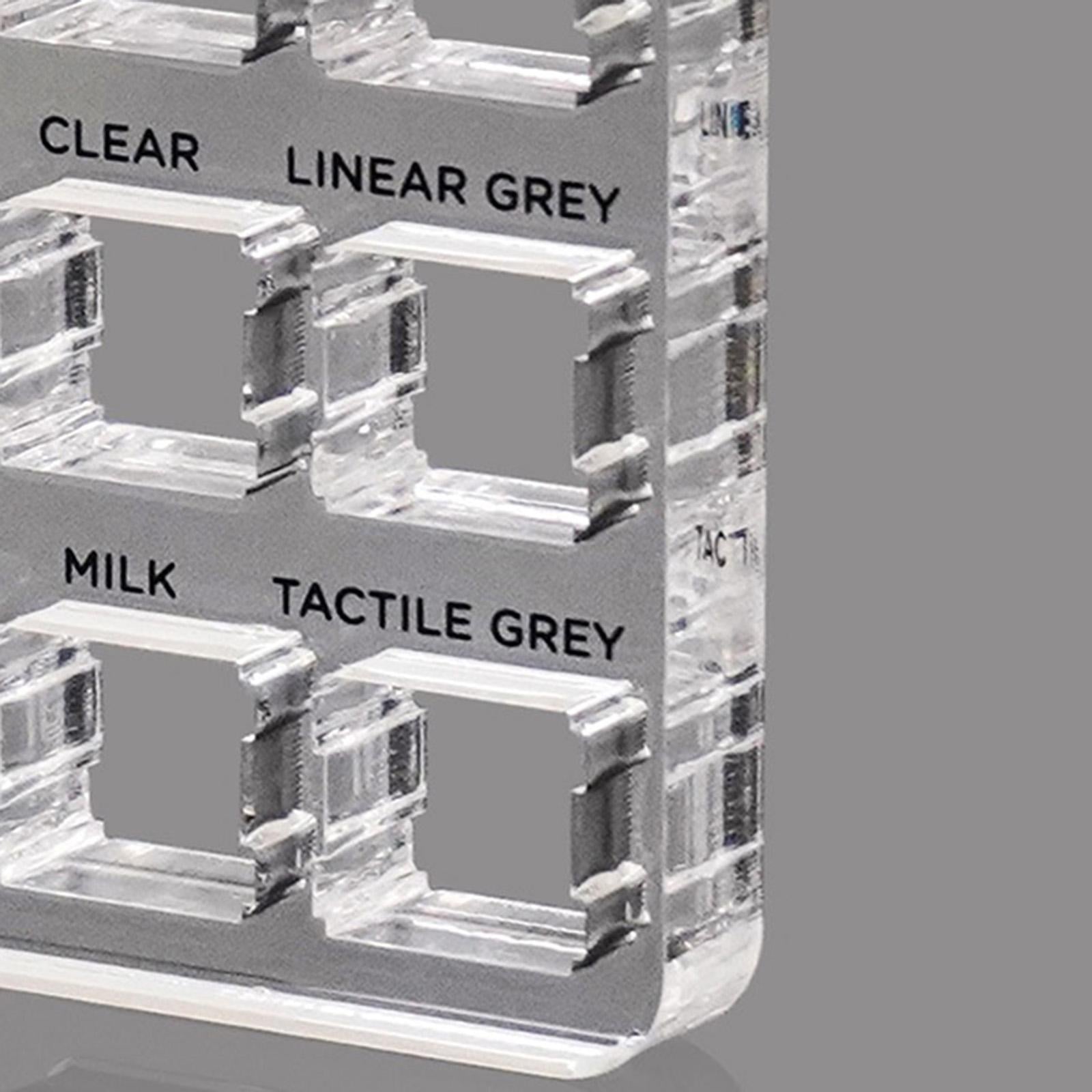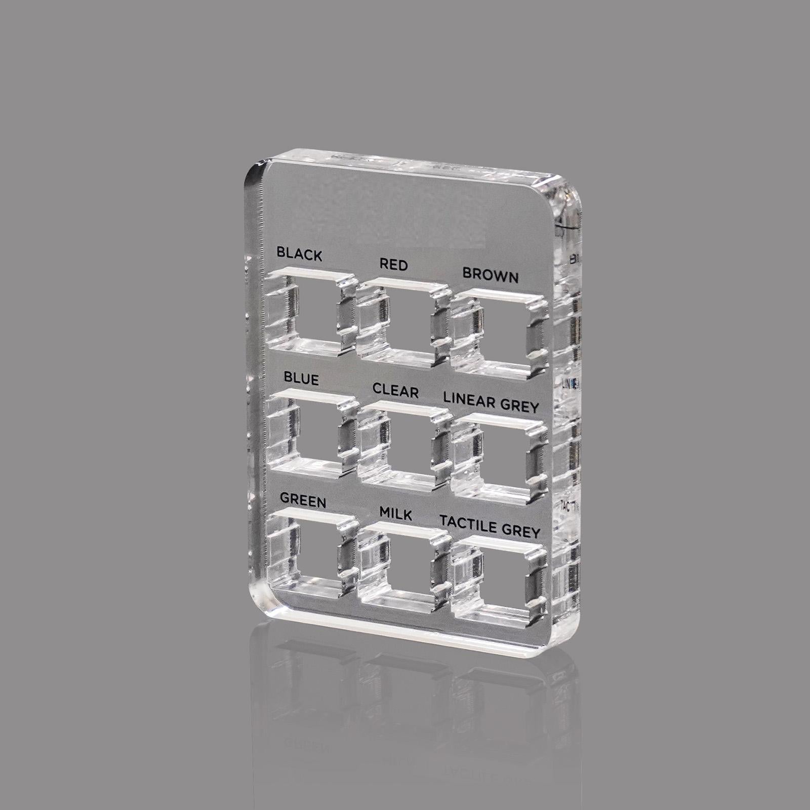 The tester kit contains 9 different switches: Black, Red, Brown, Blue, Clear, Linear Gray, Green, Milk, Tactile Gray.
