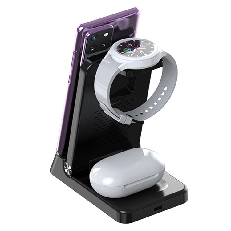 A60 4-in-1 15W Wireless Charger Folding Cell Phone Charging Stand Headset Smart Watch Charging Station with Clock (For Apple Watch Version) - Black