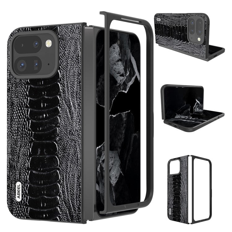 ABEEL For Google Pixel 9 Pro Fold 5G Case Crocodile Texture Genuine Cow Leather+PC Phone Cover - Black