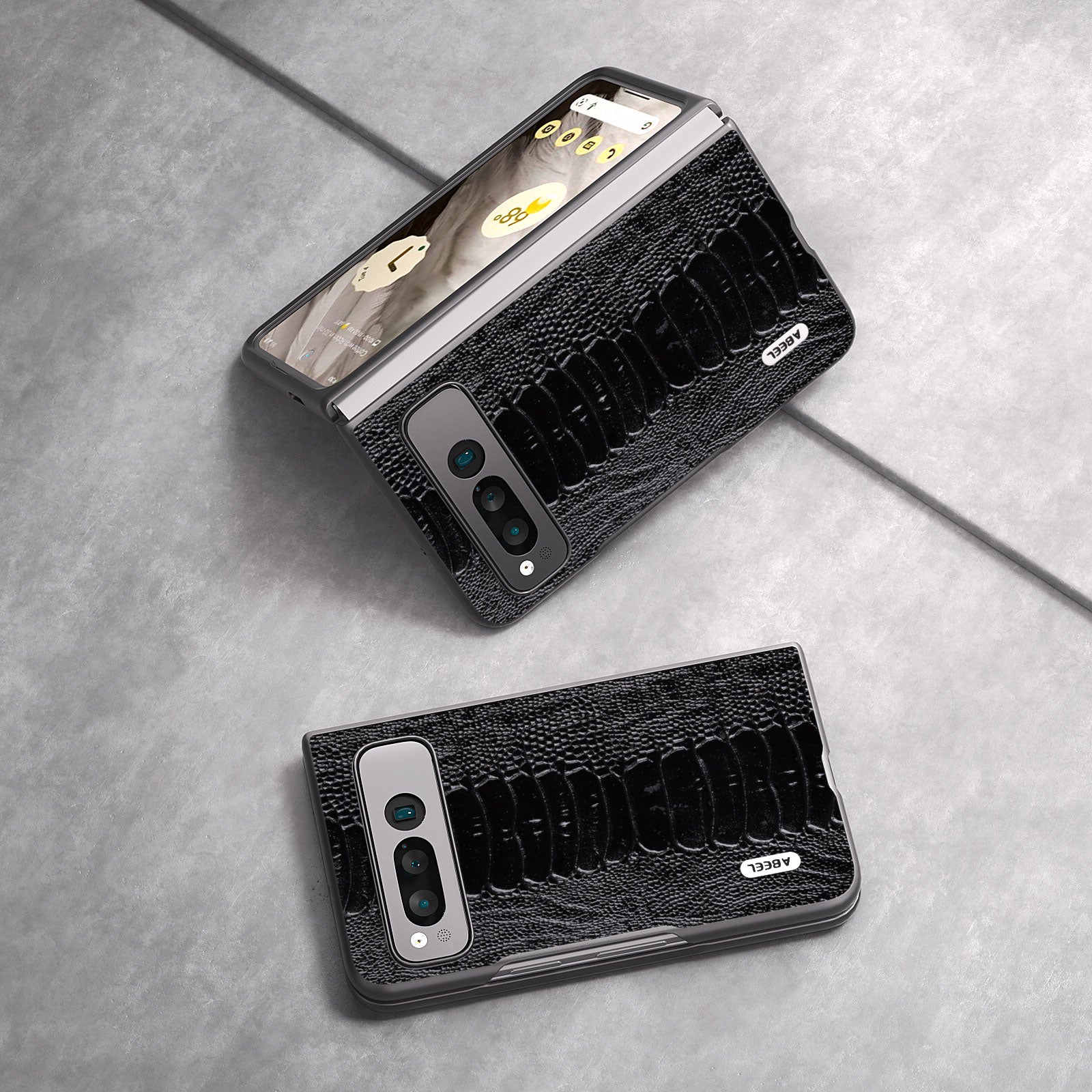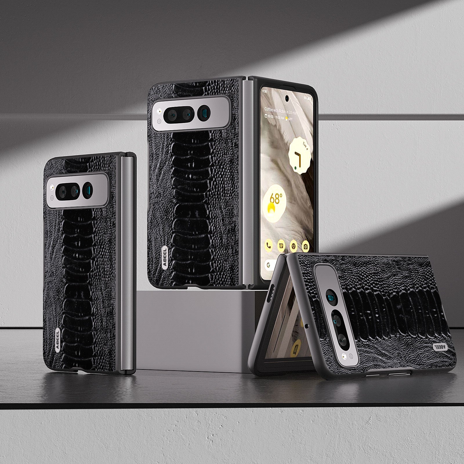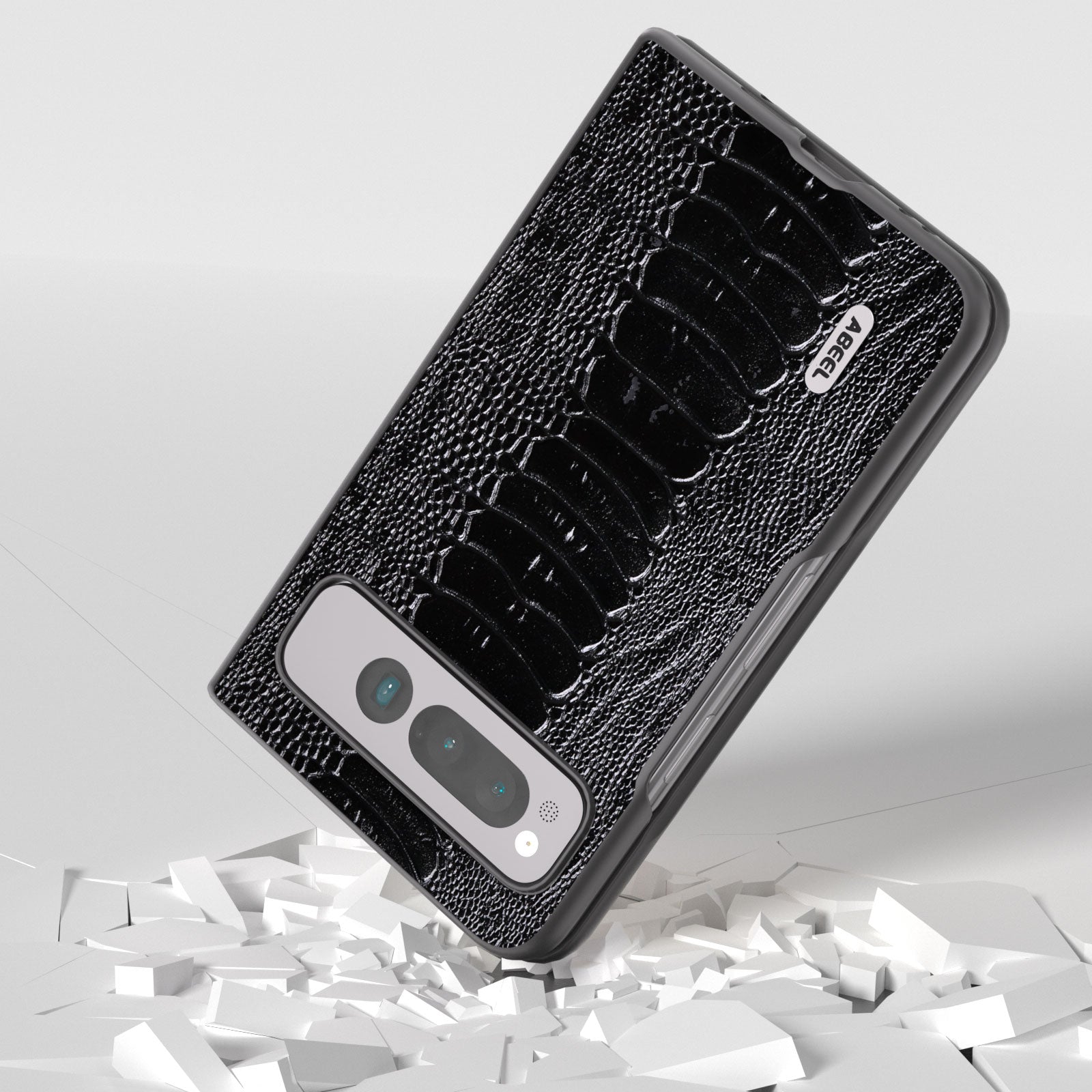 Uniqkart for Google Pixel Fold Crocodile Texture Phone Case Genuine Cow Leather+PC Anti-Fall Cover - Black