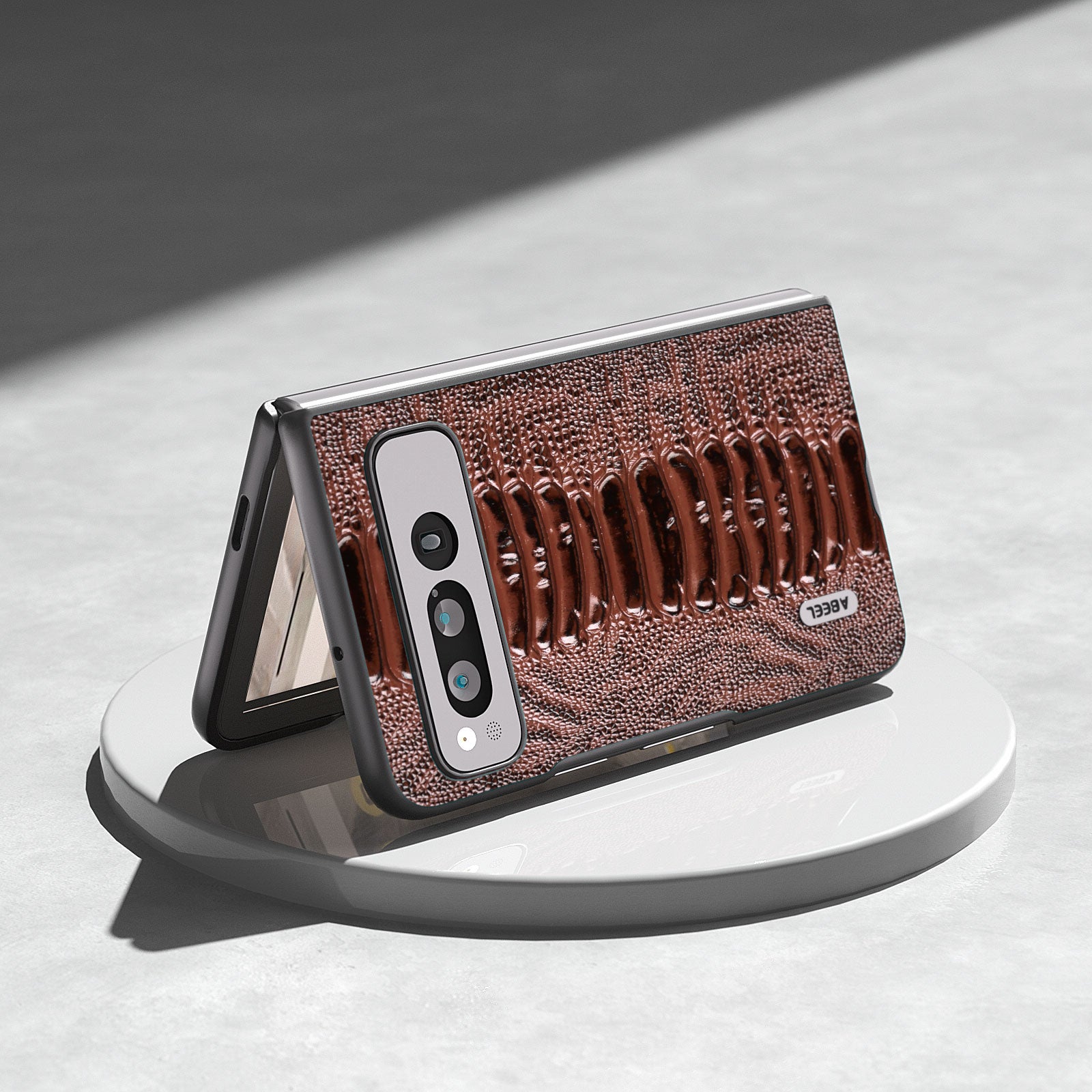 Uniqkart for Google Pixel Fold Crocodile Texture Phone Case Genuine Cow Leather+PC Anti-Fall Cover - Brown