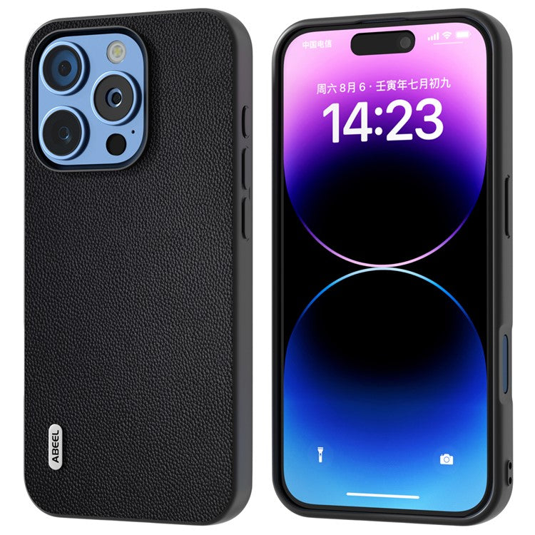 ABEEL For iPhone 16 Pro Case Genuine Cow Leather PC Phone Cover - Black