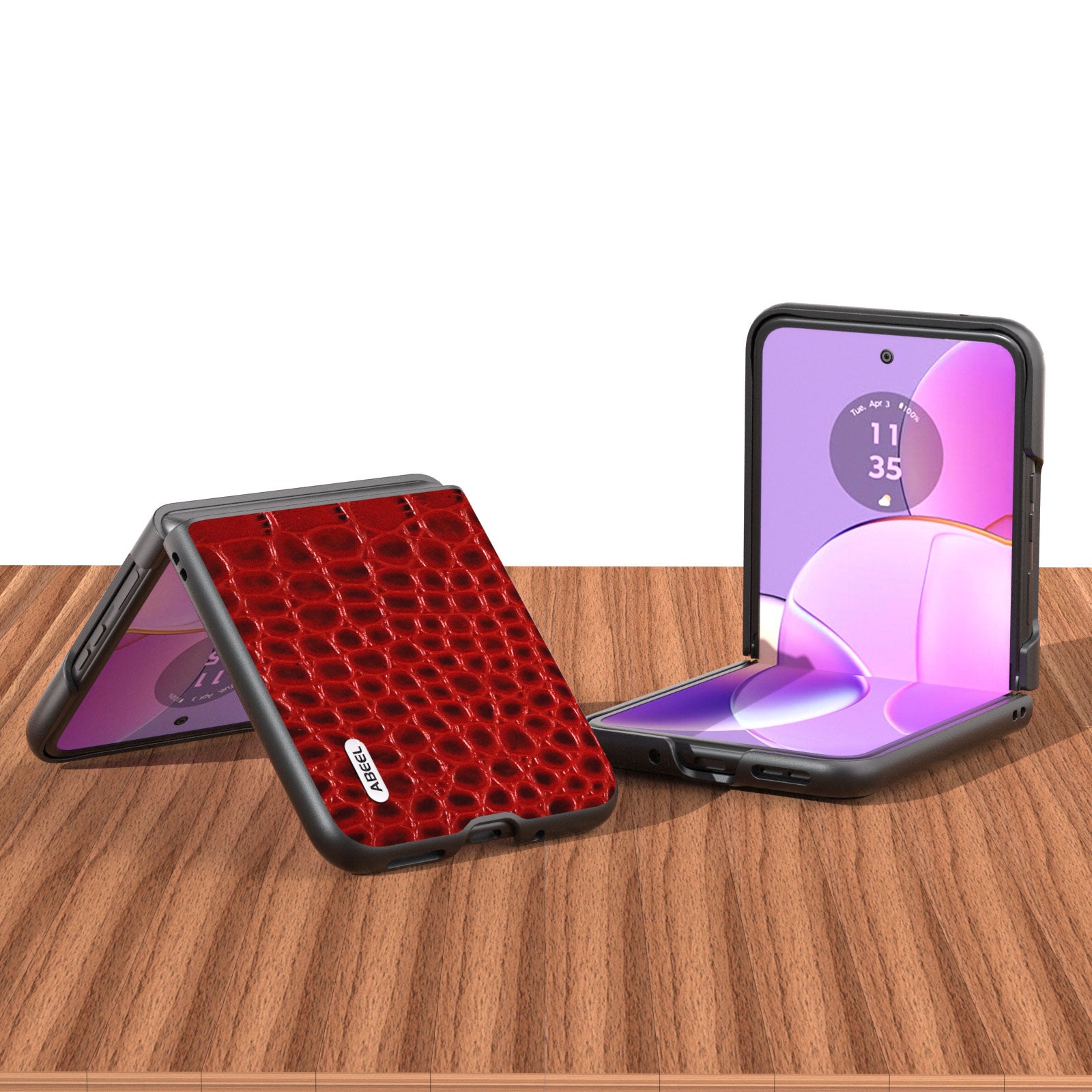 Uniqkart For Motorola Razr 40 5G Protective Case Genuine Cow Leather Coated PC Crocodile Texture Phone Cover - Red
