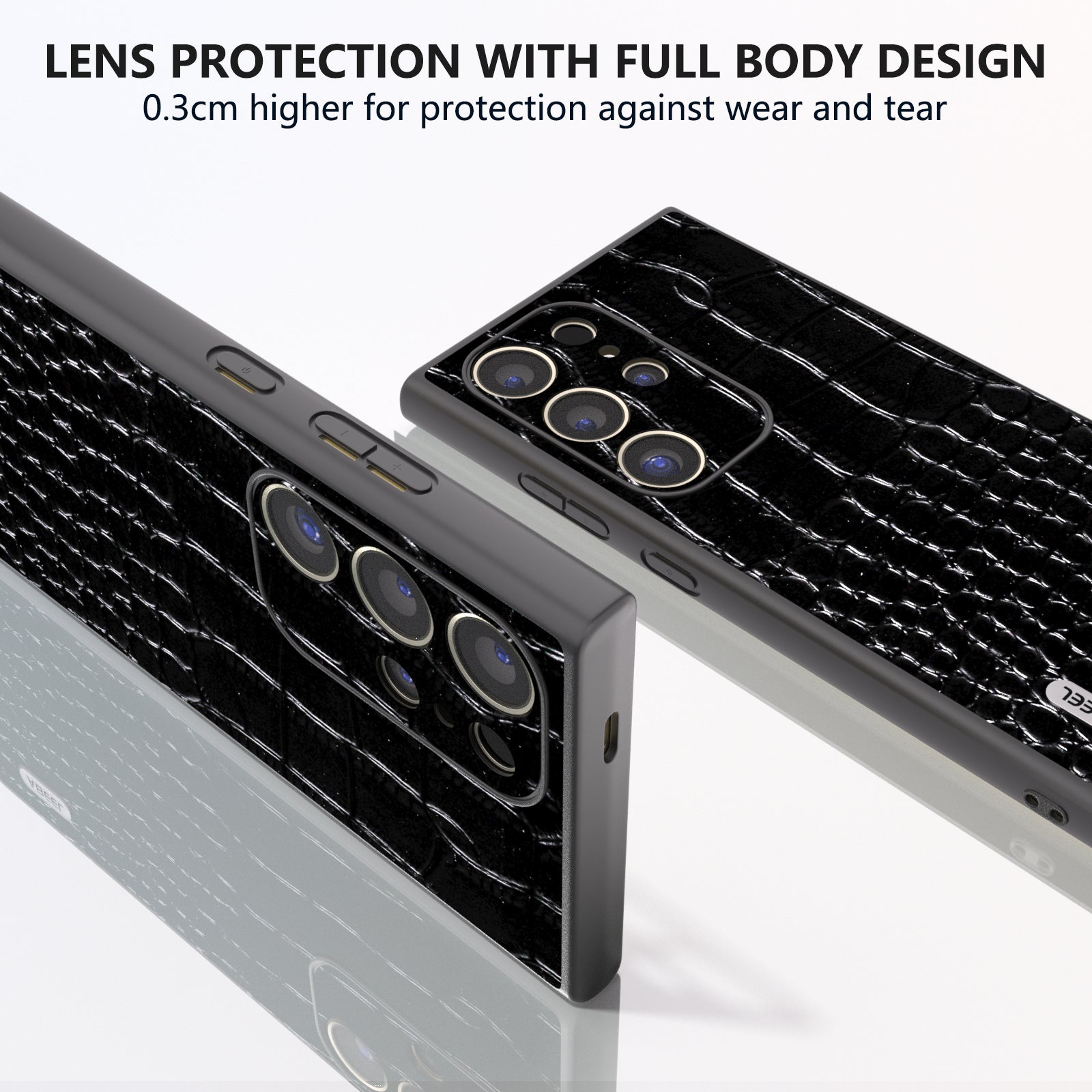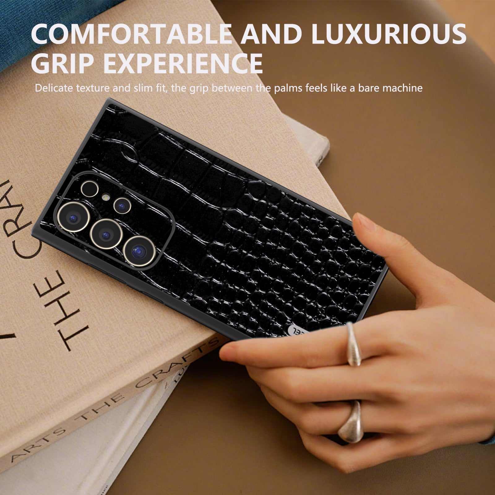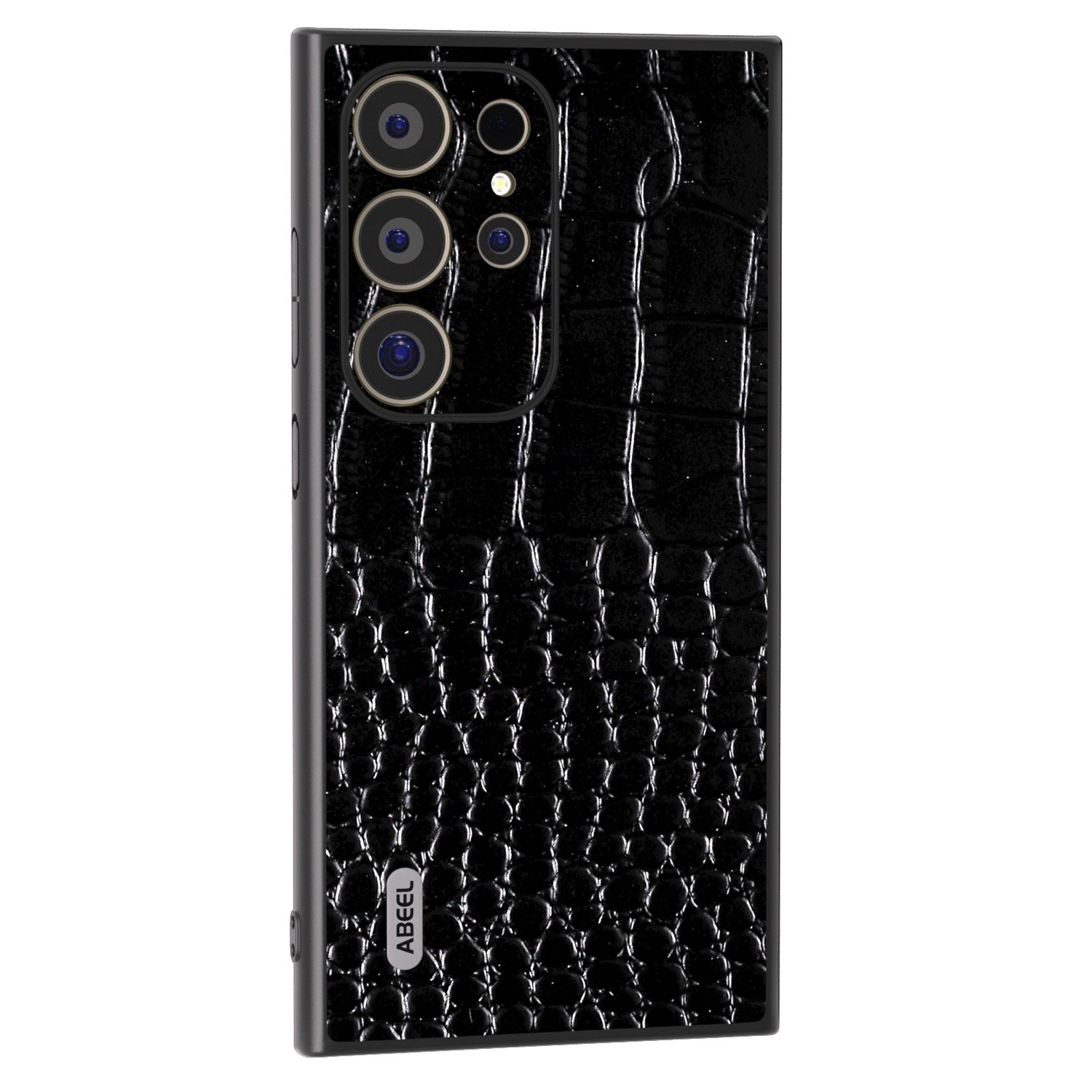 ABEEL For Samsung Galaxy S24 Ultra Case Crocodile Texture Genuine Cow Leather+PC+TPU Anti-Drop Phone Cover - Black