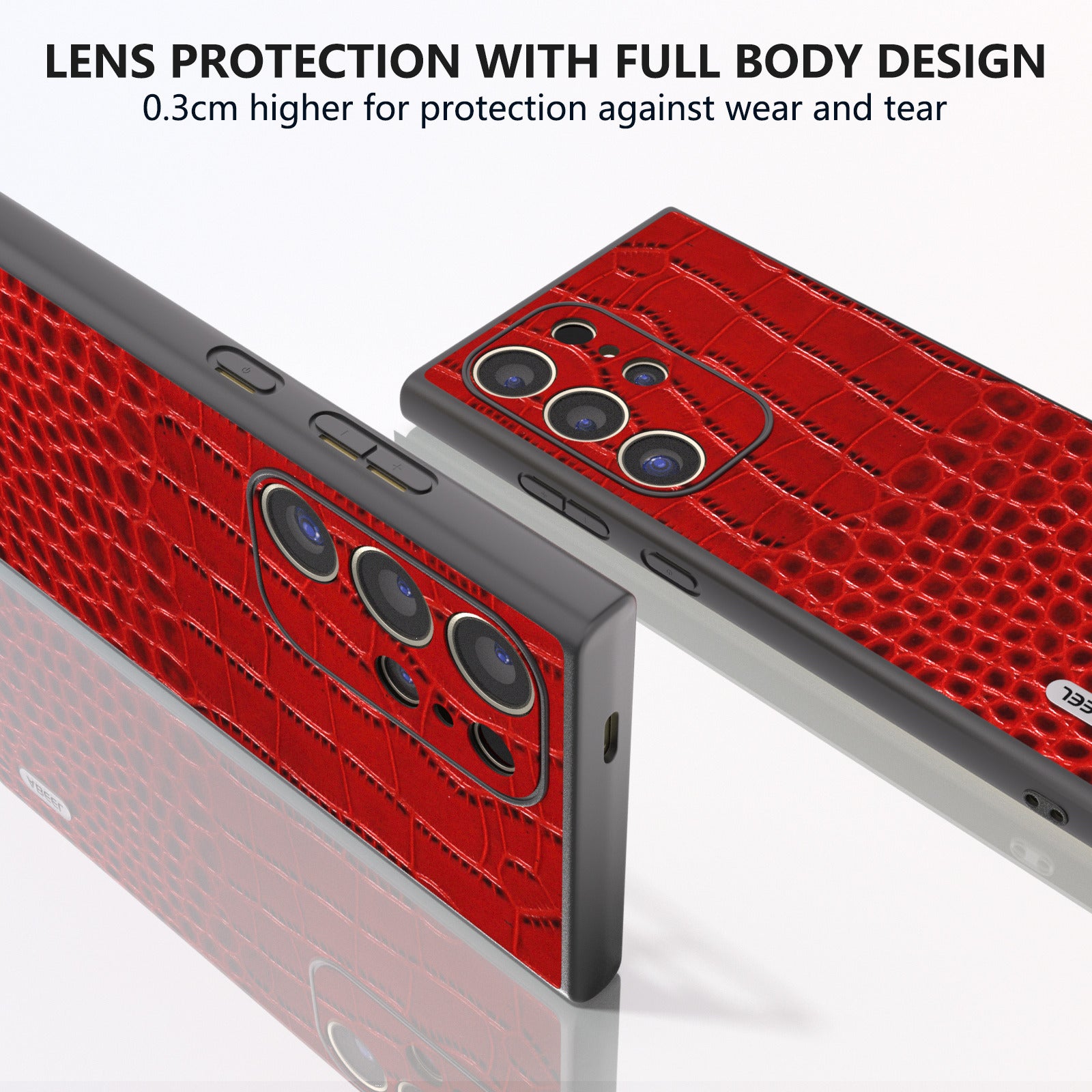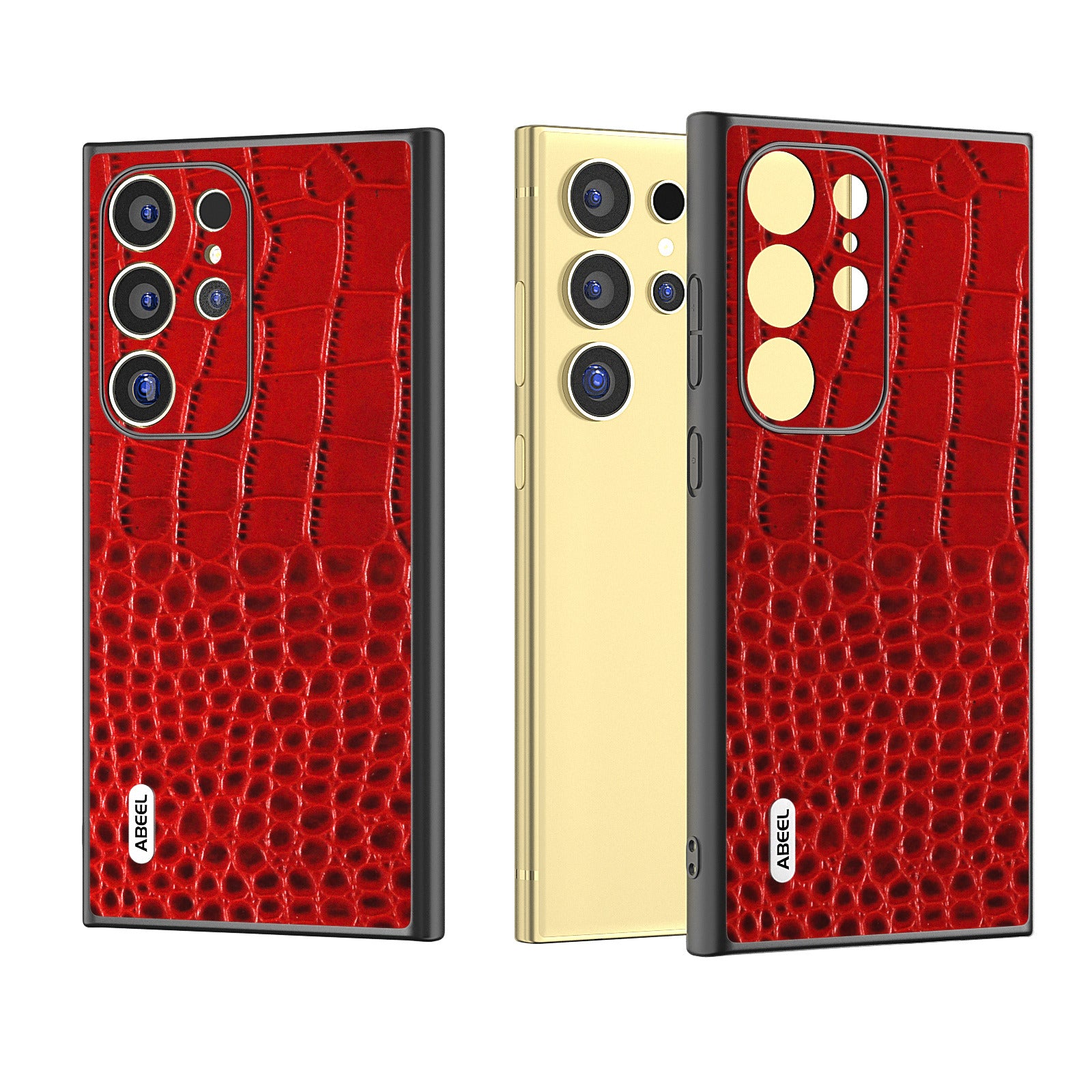 ABEEL For Samsung Galaxy S24 Ultra Case Crocodile Texture Genuine Cow Leather+PC+TPU Anti-Drop Phone Cover - Red