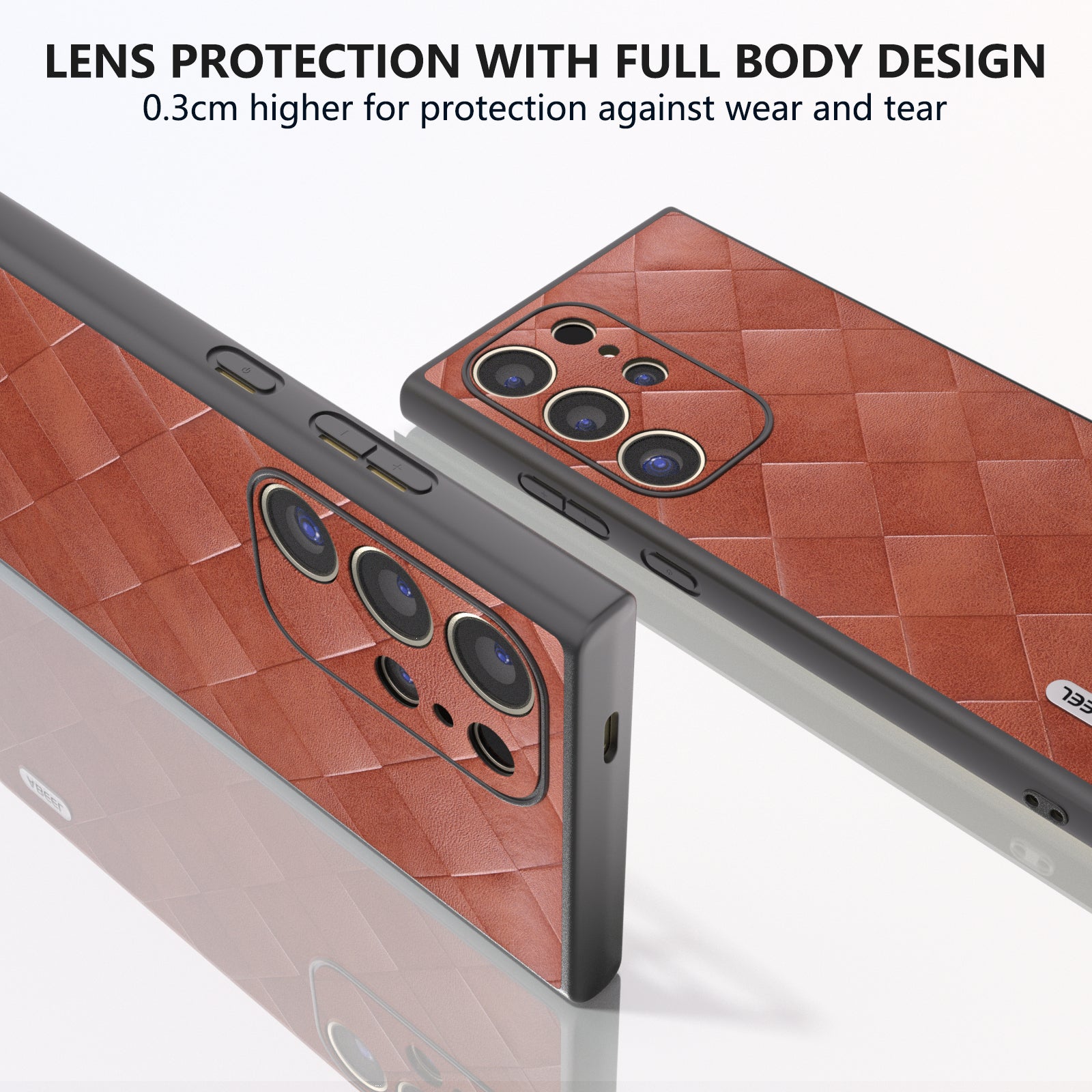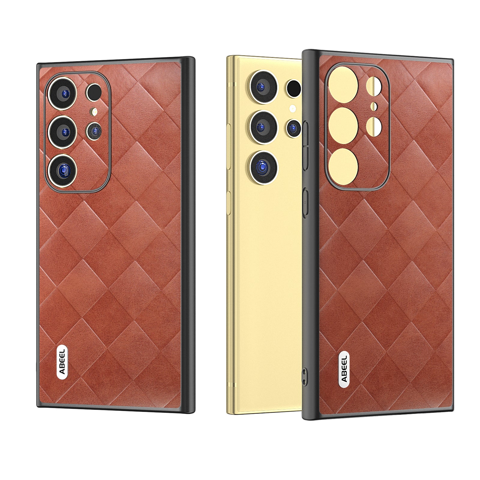 ABEEL For Samsung Galaxy S24 Ultra Case Grid Texture PU Leather+TPU+PC Protective Phone Cover - Brown