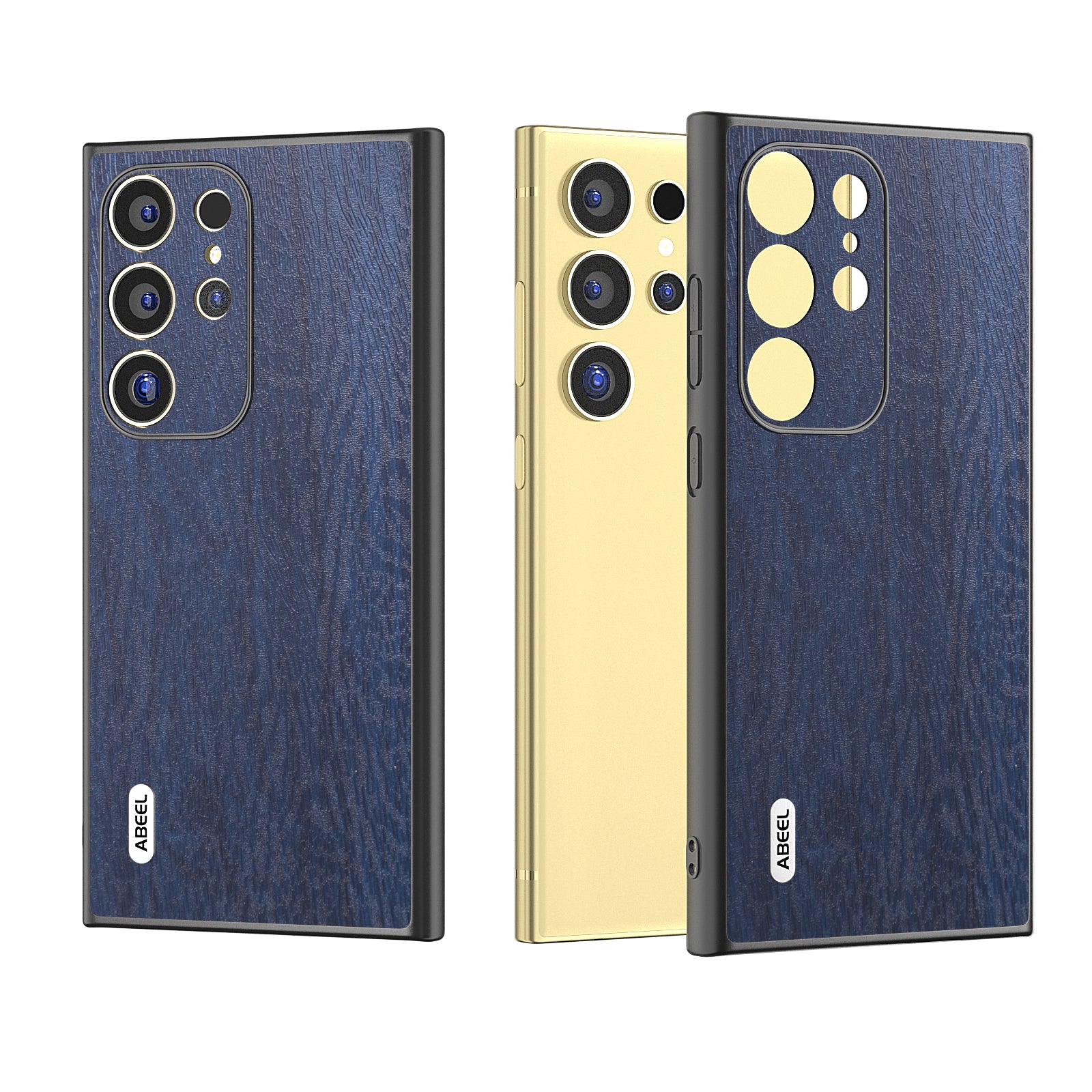 ABEEL For Samsung Galaxy S24 Ultra Case Wood Texture Leather Coated PC+TPU Hybrid Cover - Blue
