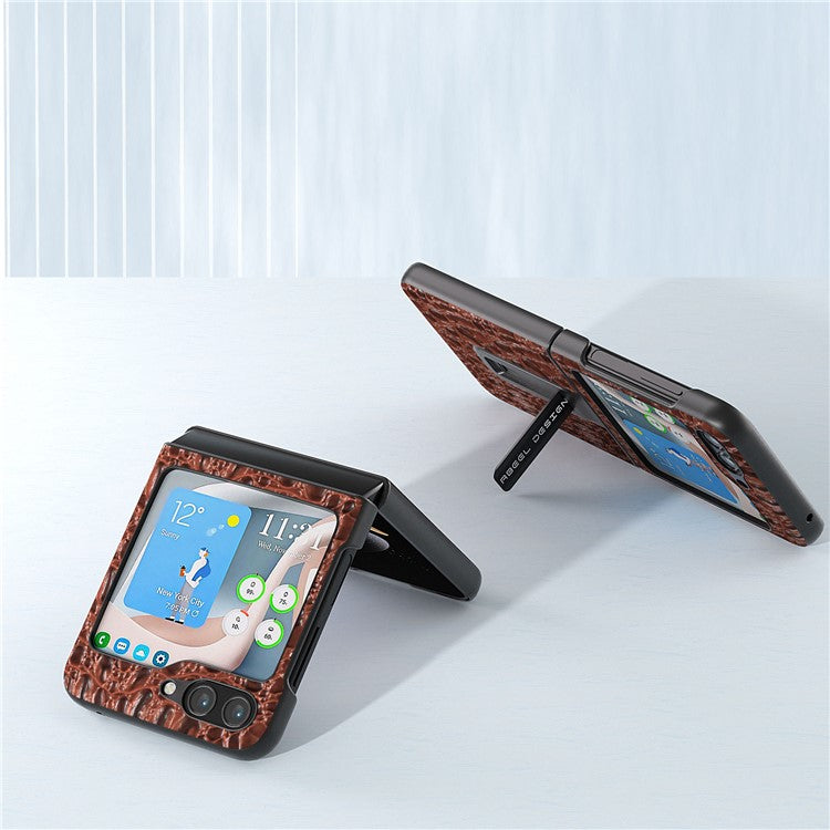 ABEEL For Samsung Galaxy Z Flip5 5G Kickstand Back Cover Genuine Cow Leather+PC Canopy Texture Phone Case - Brown