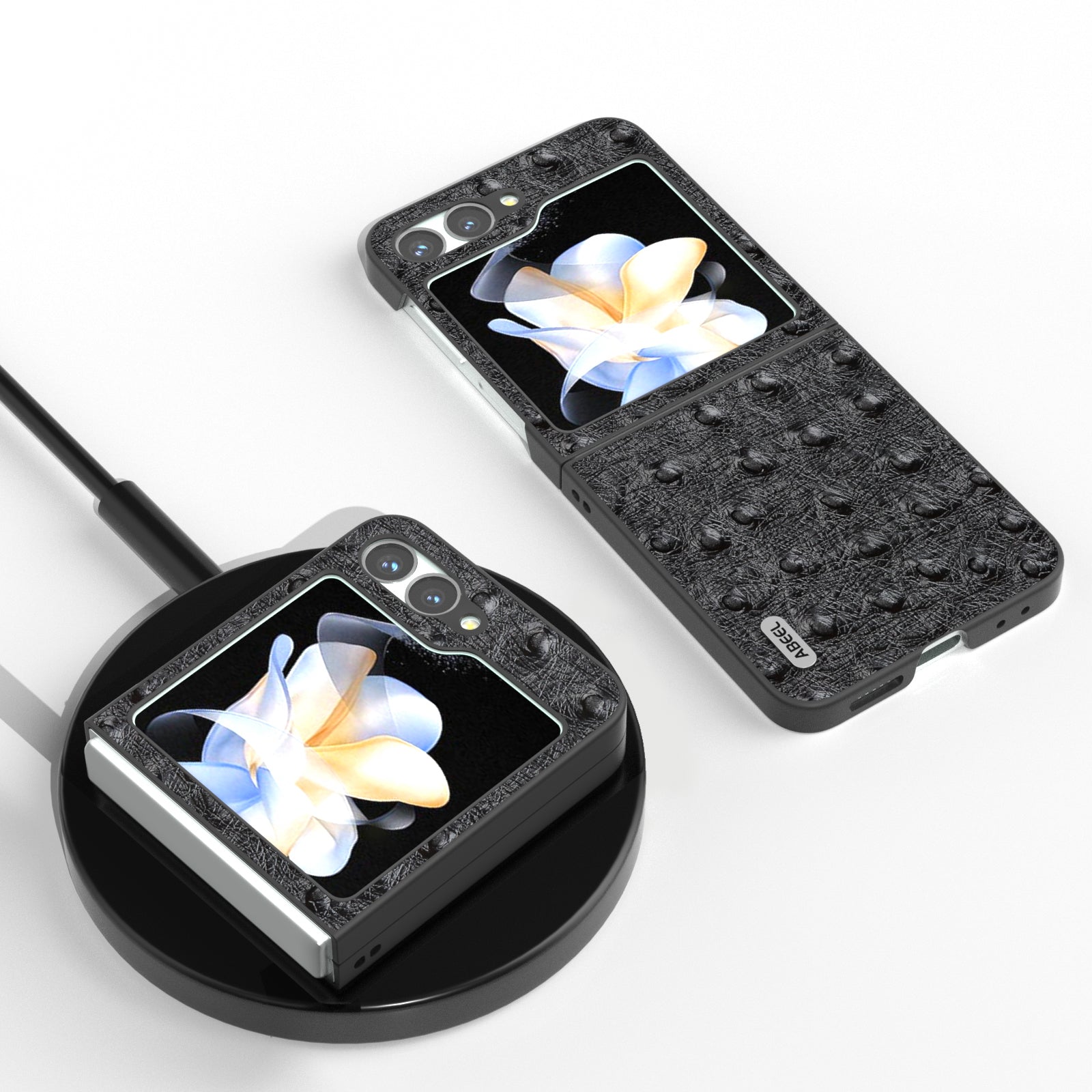 ABEEL For Samsung Galaxy Z Flip6 5G Case Ostrich Texture Genuine Cow Leather Back Cover - Black
