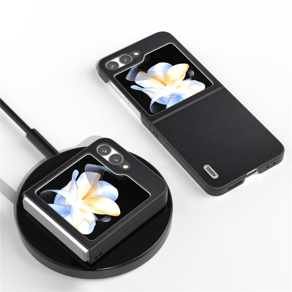 ABEEL For Samsung Galaxy Z Flip7 FE 5G / Z Flip6 5G Case Black Edge Genuine Cow Leather PC Phone Cover - Black