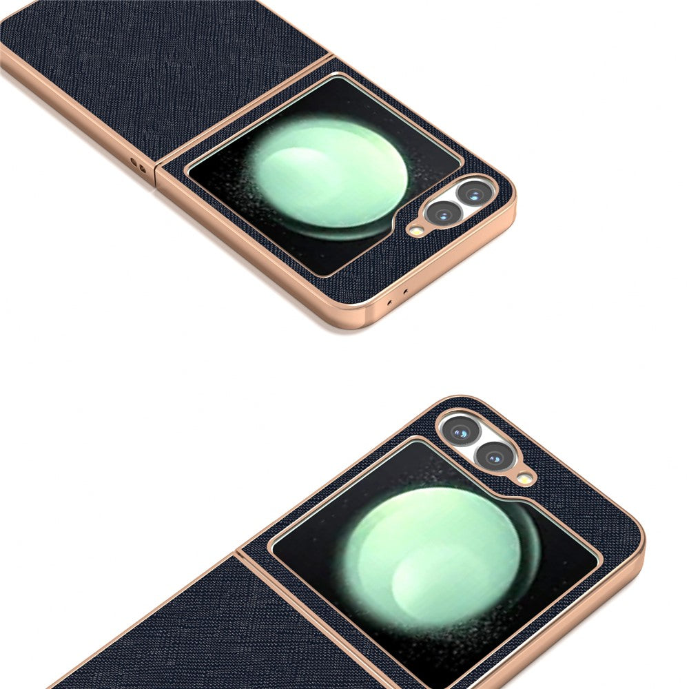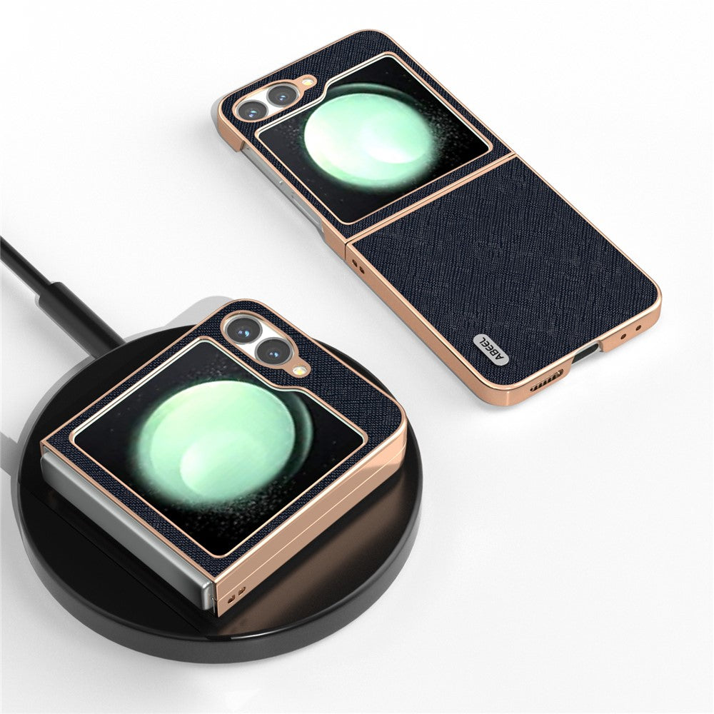 ABEEL For Samsung Galaxy Z Flip7 FE 5G / Z Flip6 5G Case Electroplating Phone Cover Cross Texture Genuine Cow Leather+TPU Protective Case - Blue