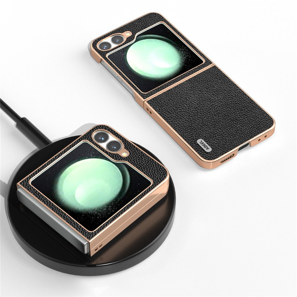 ABEEL For Samsung Galaxy Z Flip7 FE 5G / Z Flip6 5G Case Genuine Cow Leather+PC+TPU Electroplating Phone Cover - Black