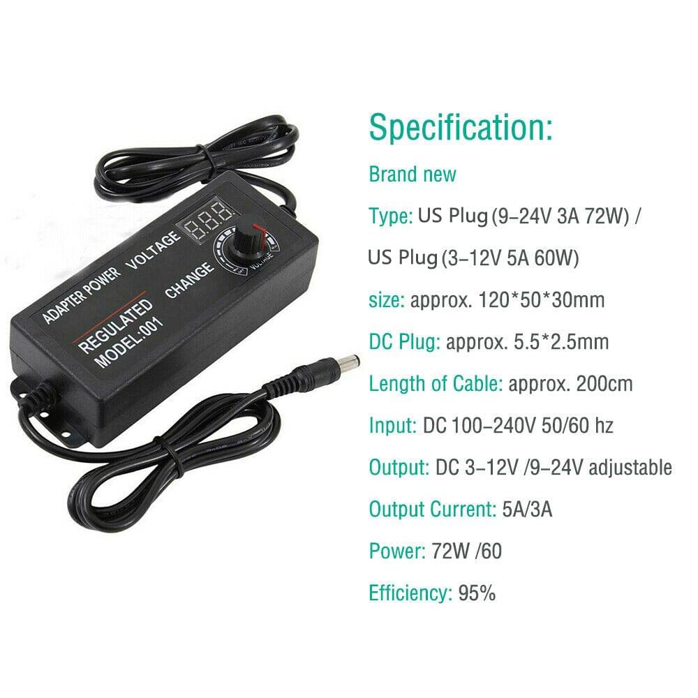 The voltage adaptor is portable in size and weight convenient to install and use. High quality components long service life. Plug and play easy to use. Fine workmanship and stable performance.Features:Delicate size lightweight to carry.Plug and play easy to use.High quality components long service life.Fine workmanship and stable performance.Manual rotary knob adjust simple and quick.Specifications:Type: US Plug +UK Adapter (9-24V 3A 72W) / US Plug + UK Adapter(3-12V 5A 60W)Color: BlackInput Voltage: AC 100V-240VInput Voltage Frequency: 50-60HzRated Output Electricity: 2A-5APackage Weight: 172g / 6.07ouncesPackage Size: 133 * 50 * 32mm / 5.24 * 1.97 * 1.26inPacking List:1 * Voltage Adaptor