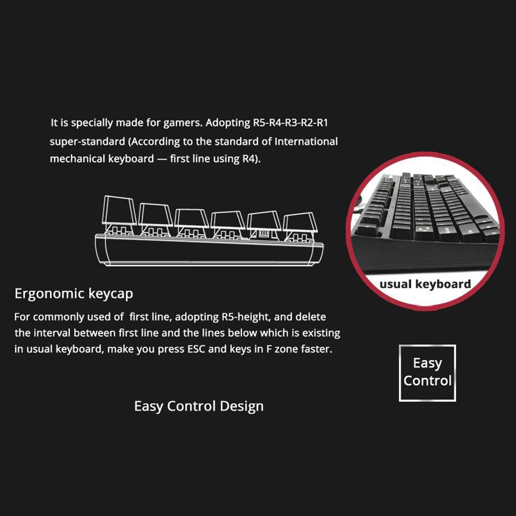 �BLUE / BLACK SWITCHES‘Special Modified Blue/Black Switches give you the purest mechanical experience. Adopting R5 ergonomic key style in various key shape, which is different from traditional keyboards, you can click the ESC F Keys more quickly. Anti-fatigue, suitable for long time use.
