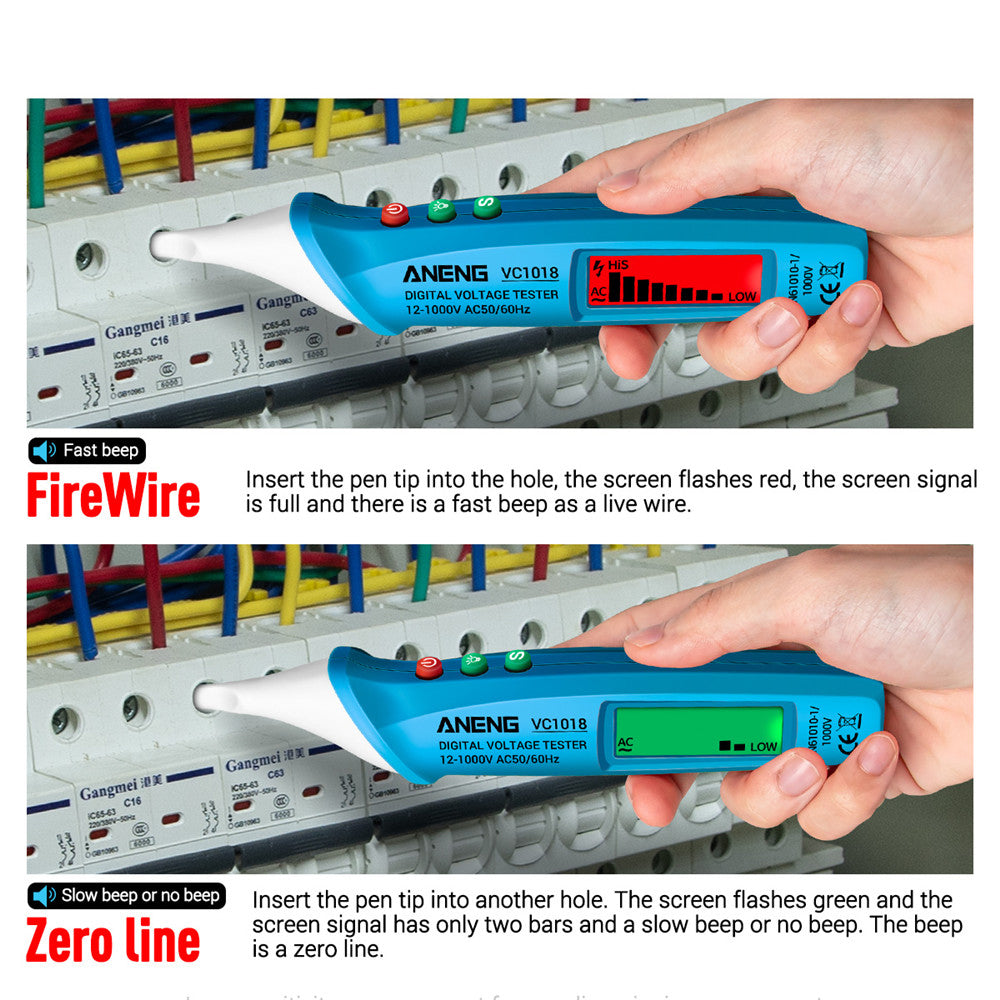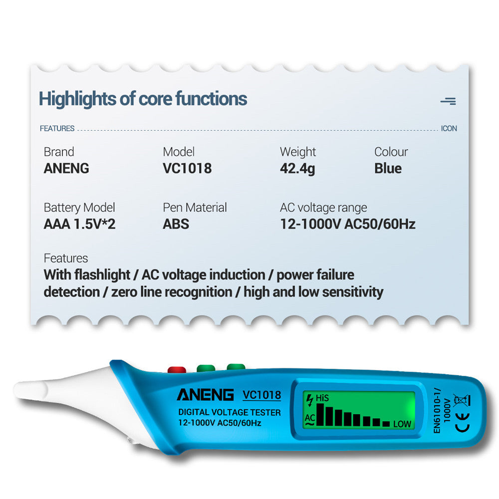 Aneng VC1018 12V-1000V Non-contact Electric Sensor Tester Pen Digital AC Voltage Meter Buzzer Detector with LCD Screen - Blue