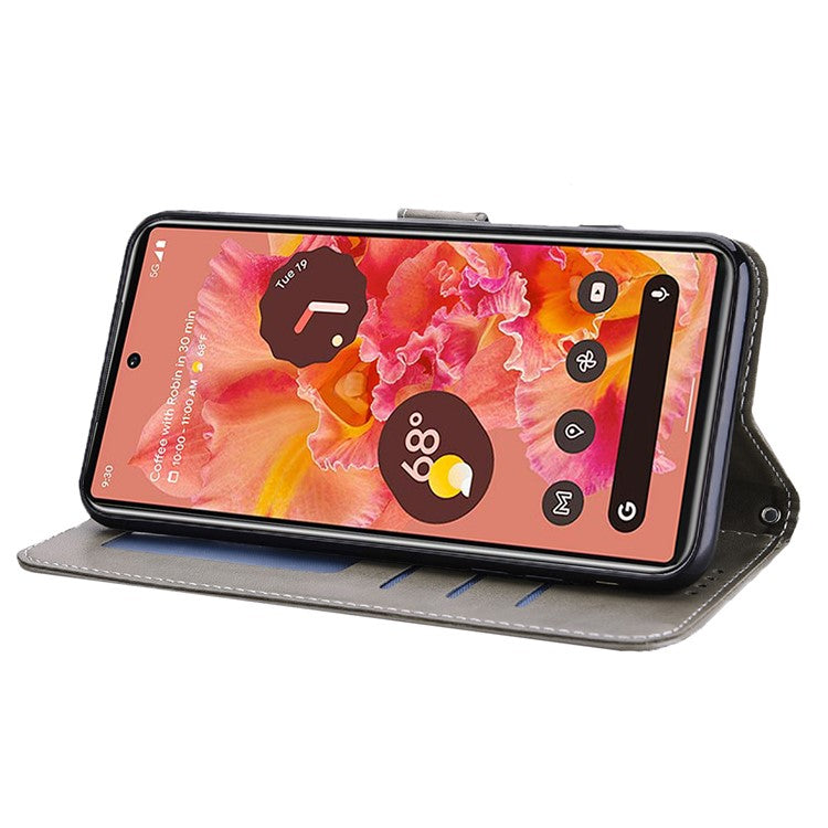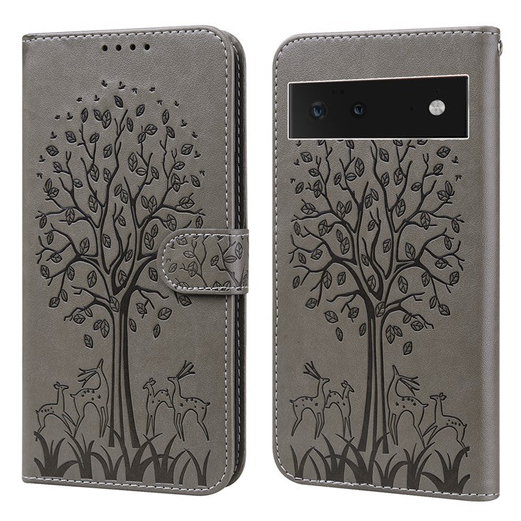 Anti-scratch Stand Phone Cover Imprinted Elk and Tree Pattern Wallet Leather Phone Case for Google Pixel 6 - Grey