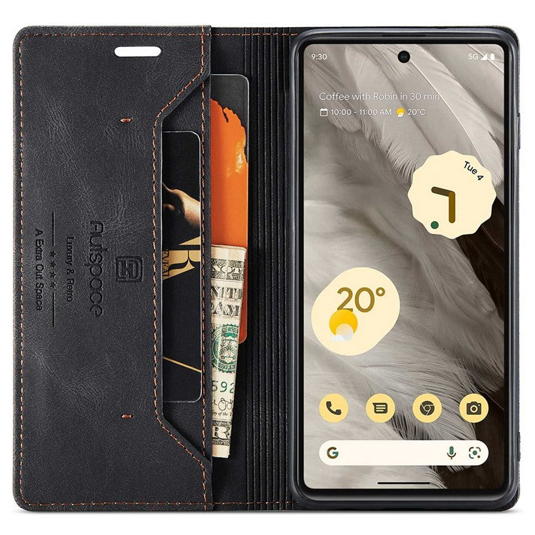 AUTSPACE A01 Series RFID Blocking Phone Case for Google Pixel 7 5G, PU Leather Drop Protection Magnetic Closure Vintage Matte Wallet Stand Cover - Black