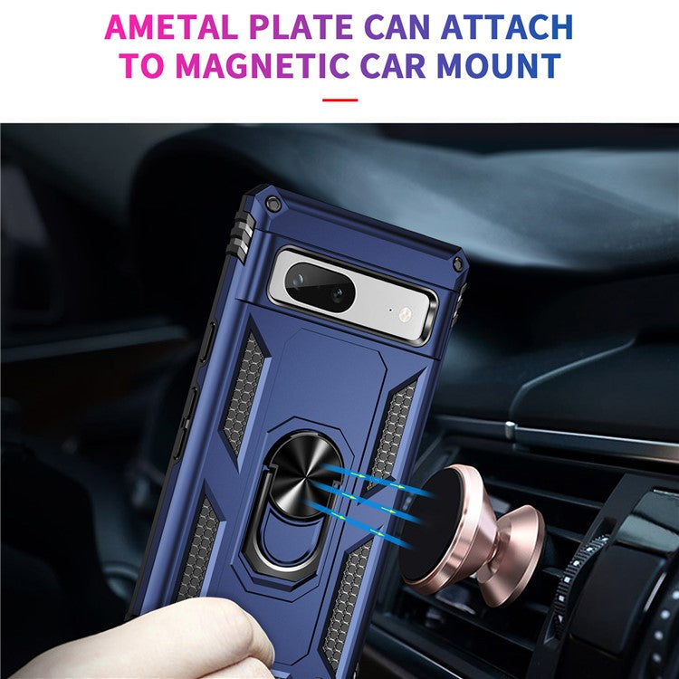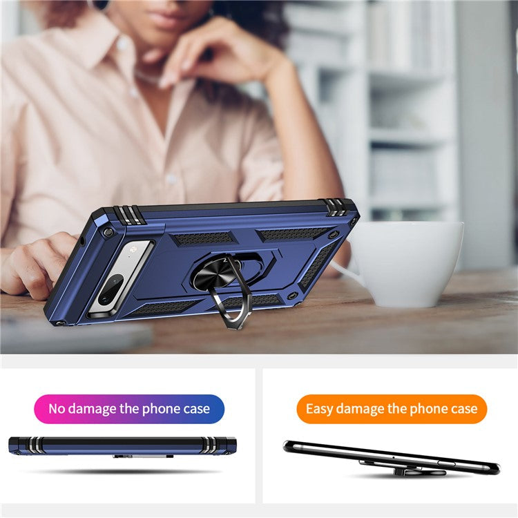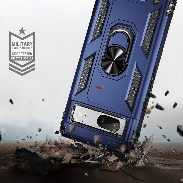 Back Protector Phone Case for Google Pixel 7a, Military Grade Anti-drop PC + TPU Protective Cover with Ring Kickstand - Blue