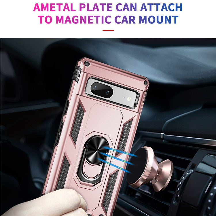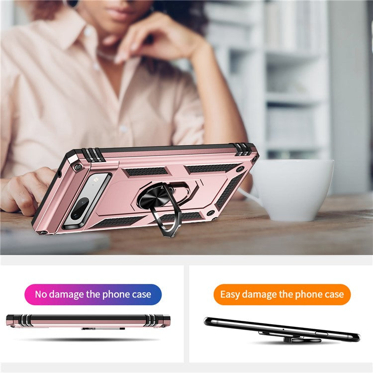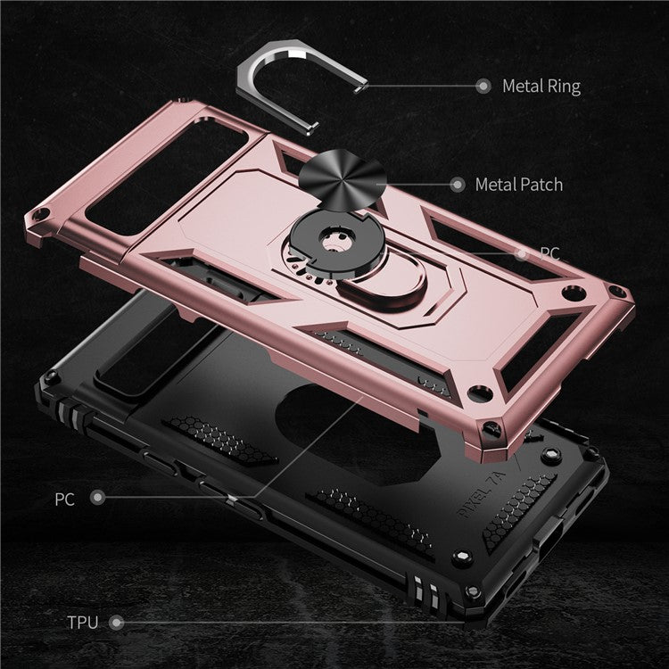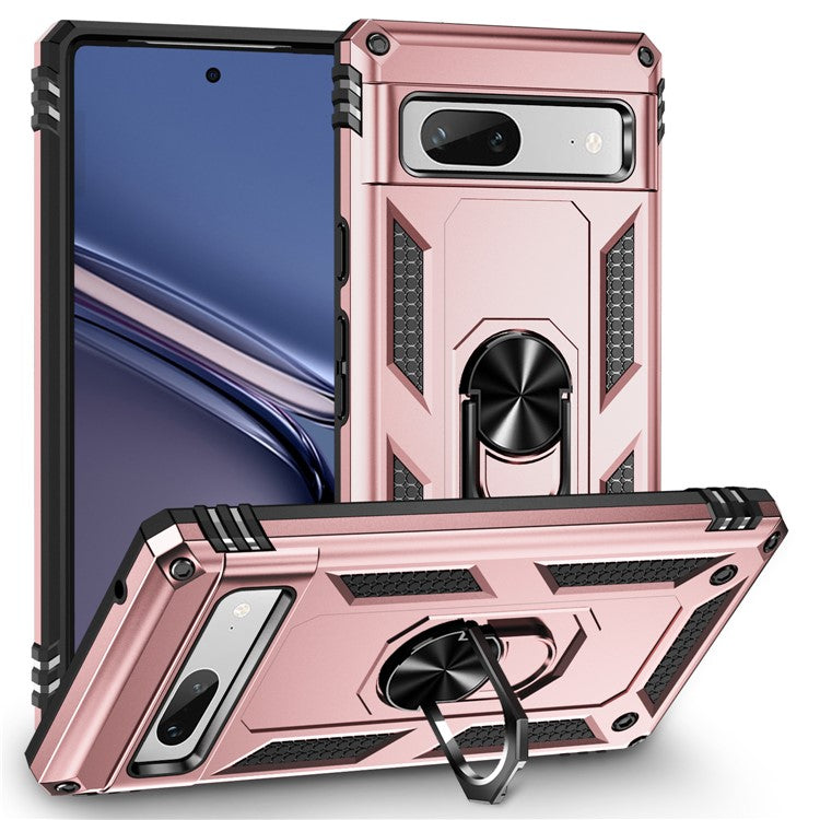Back Protector Phone Case for Google Pixel 7a, Military Grade Anti-drop PC + TPU Protective Cover with Ring Kickstand - Rose Gold