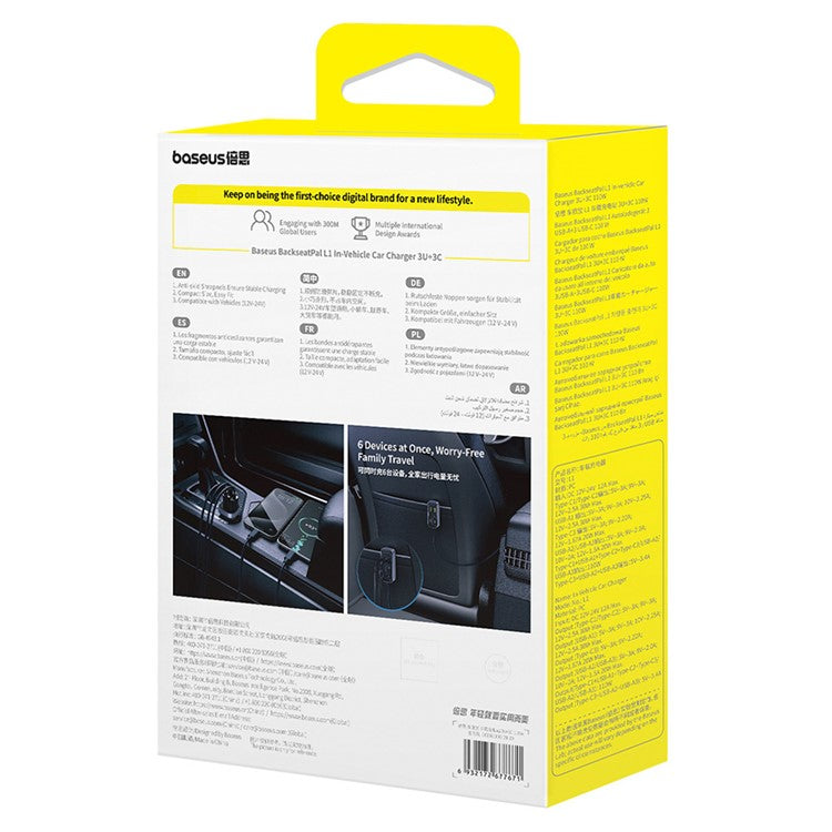 BASEUS Backseatpal L1 In-Vehicle Cigarette Lighter Car Charger 3 USB + 3 Type-C Power Strip - Black