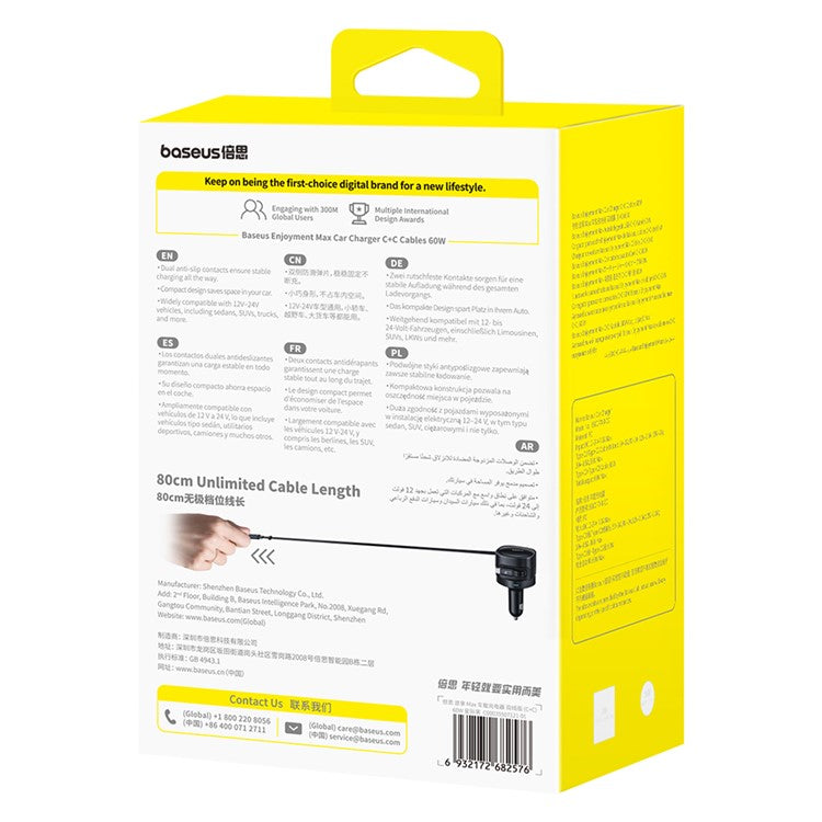BASEUS Enjoyment Max Car Charger 60W C + C Dual Cable Rotatable Design Fast Charging Retractable Cables