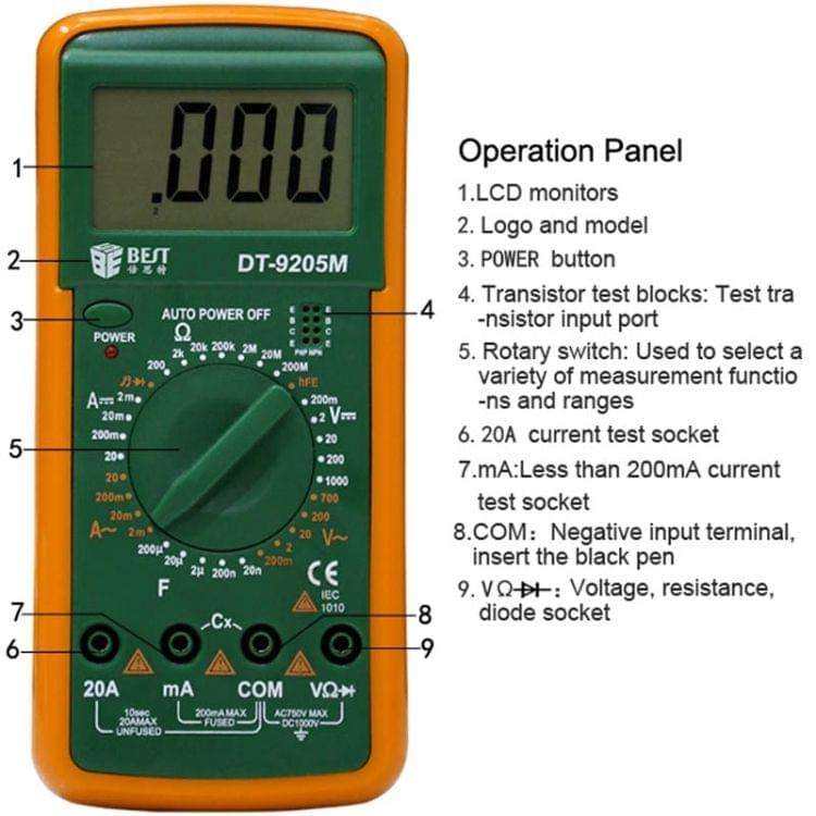 1. The BEST DT-9205M digital multimeter is an easy to operate, accurate readings, full-featured, compact, easy to carry, use battery-powered handheld large screen LCD Multimeter, DT-9205M digital multimeter for three and a half, the table can be used to Measure DC voltage / electric, AC voltage / current, resistance, capacitance test, diode test, transistor HFE measurement and circuit off, etc..