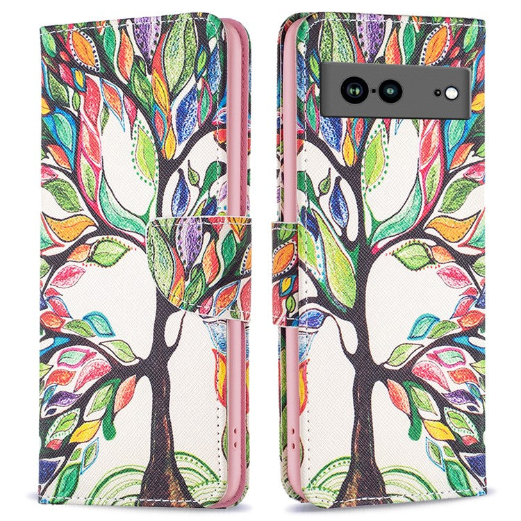BF Pattern Printing Leather Series-1 for Google Pixel 7a Anti-fall Phone Case Stand PU Leather Wallet Pattern Imprinted Magnetic Closure Flip Phone Cover - Life Tree
